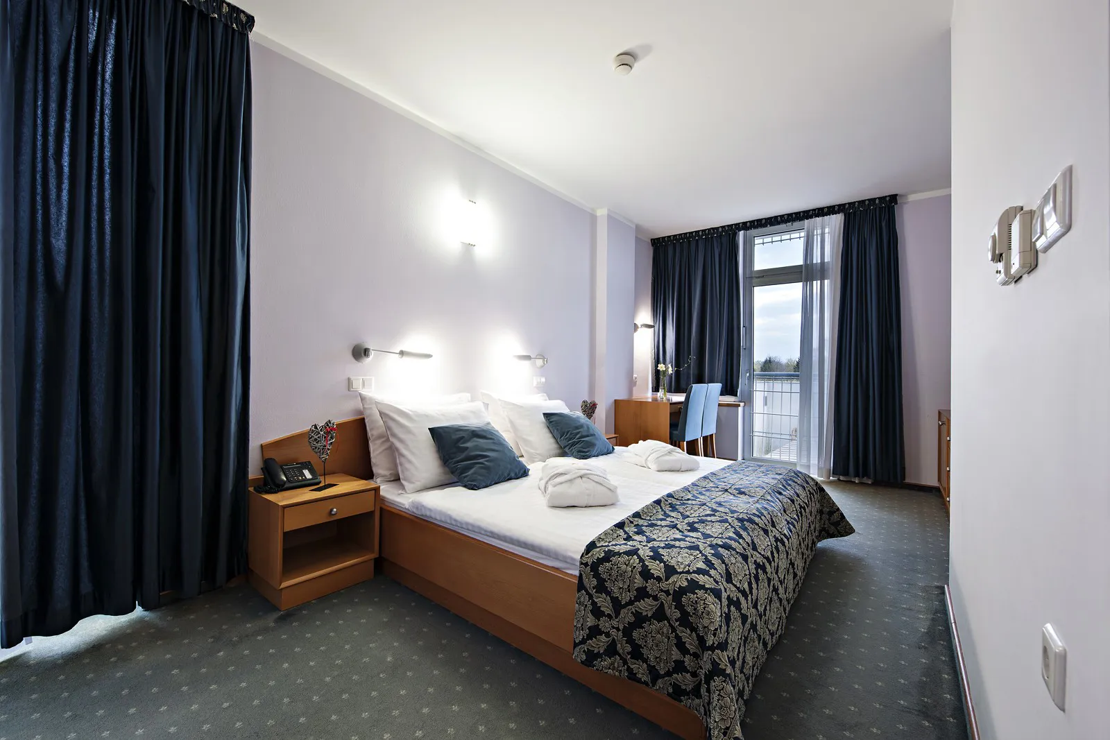 Comfortable double room with a 180 cm wide bed or two separate 90 cm wide beds with a view of the Mura River. The room (22 m2) features a bathroom with bathtub, shower and toilet as well as desk.