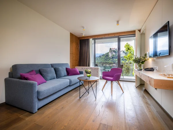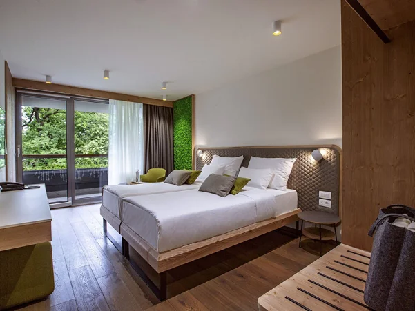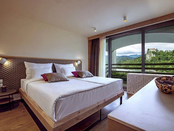 Na Bledu nas na svakom koraku oduševljava Bledsko jezero na koje se pruža prekrasan pogled ravno iz soba s tematikom vode, koje su umirujuće plave boje s valovitim elementima i zidnim slikama vode. Hotelske sobe s pogledom na park zato su umirujuće zelene, sa zidnih slikarija pozdravljaju slike šuma i drveća.