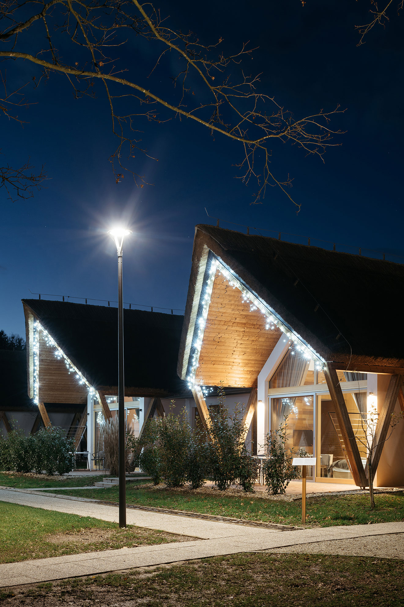 Između kućica vijuga staza za bosonoge koja je načinjena od šest različitih podloga iz prekmurske prirode. U parku pokraj kućica pronađite svoje omiljeno drvo i zagrlite ga. Stres će nestati!