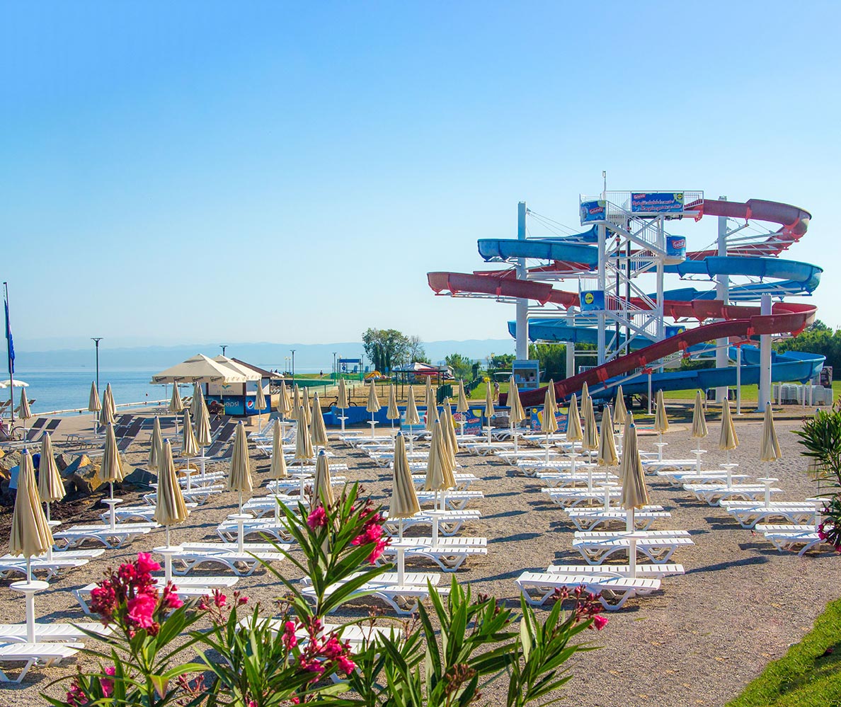 La Spiaggia San Simon si trova in una baia verdeggiante, dove un tempo sorgeva un porto romano, i cui mosaici sono ancora oggi visibili sotto la superficie dell’acqua. L’accesso al mare dalla spiaggia avviene dal molo. Gran parte dell’area balneabile è ricoperta da pini e acacie, che offrono una piacevole ombra. Nei mesi più freddi, il divertimento in acqua si trasferisce dalla spiaggia alla piscina coperta dell’Hotel Haliaetum.