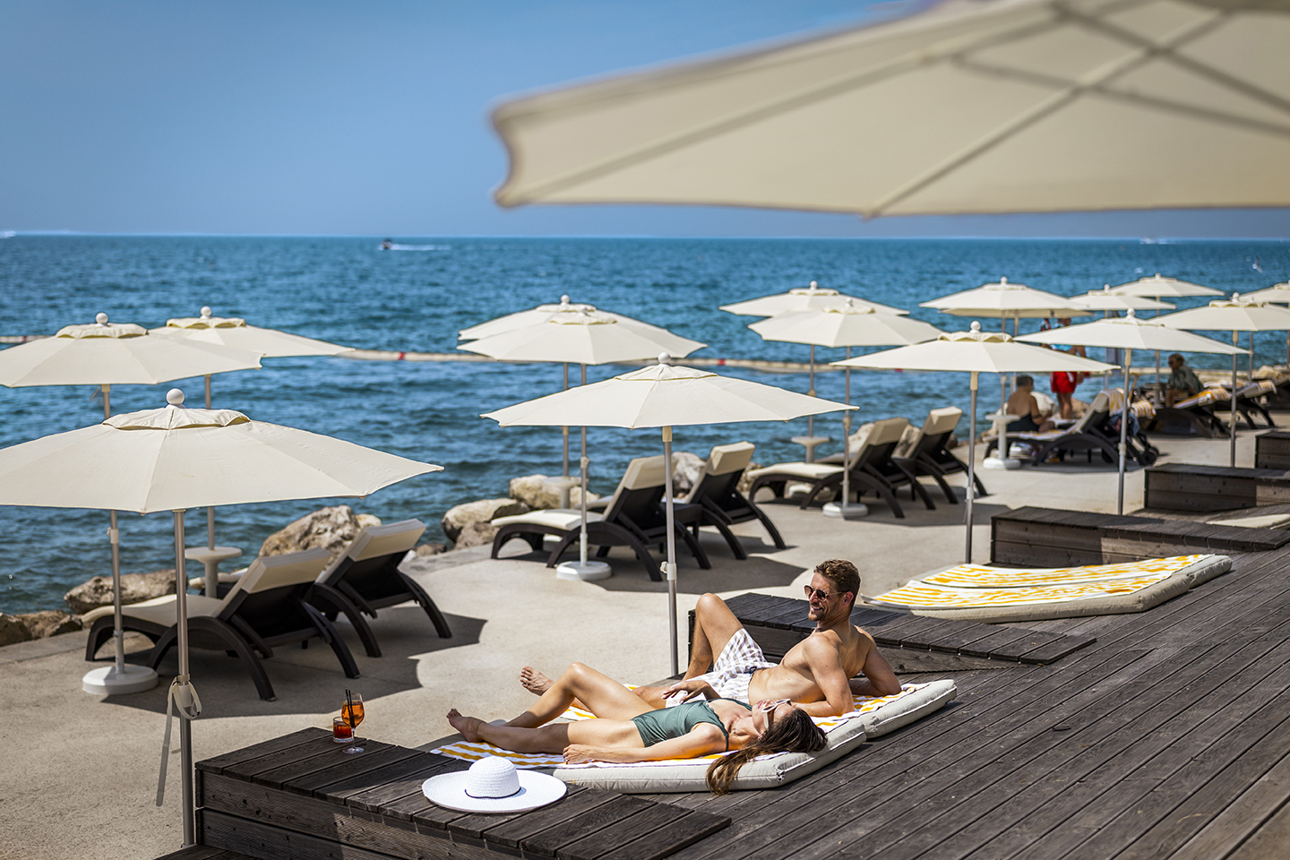 La ben curata spiaggia di fronte al Grand Hotel Bernardin si può fregiare della Bandiera Blu. Per gli ospiti dell'hotel sono disponibili gratuitamente lettini e ombrelloni mentre, a un costo aggiuntivo, è disponibile anche il nostro ricco programma estivo Marine Summer Club, per un’esperienza balneare unica e irripetibile. L’esclusiva spiaggia, che offre una vista unica sull’azzurro infinito, è disponibile a pagamento anche per gli ospiti esterni.