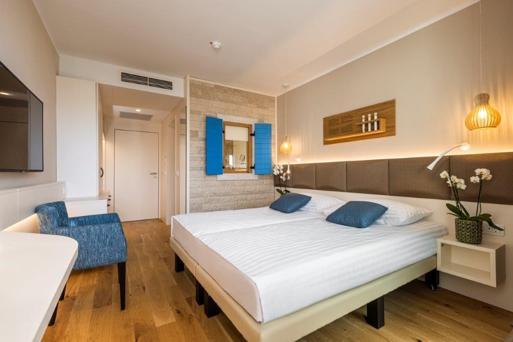 Camera vista porticiolo La camera offre: balcone, TV satellitare, telefono, radio, mini bar, aria condizionata, scrivania, bagno - doccia, asciugacapelli, set di cortesia pacchetto, minibar, cassaforte, servizio sveglia / sveglia. Dimensioni della camera: 19 m2 Dimensione Letti: 1 letto matrimoniale 160 x 200 centimetri o letti separati 100 x 200 centimetri
