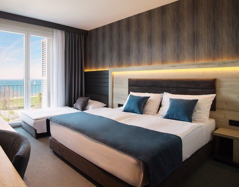 Ponudba v sobi: telefon, Sat-Tv, kopalnica s tuš kabino, fen, klima Velikost sobe: 23 m2 Velikost postelje: 1 zakonska postelja 160 x 200 cm + raztegljiv kavč 90 x 200 cm Soba lahko sprejme enega otroka na dodatnem ležišču do 15. leta starosti brezplačno.