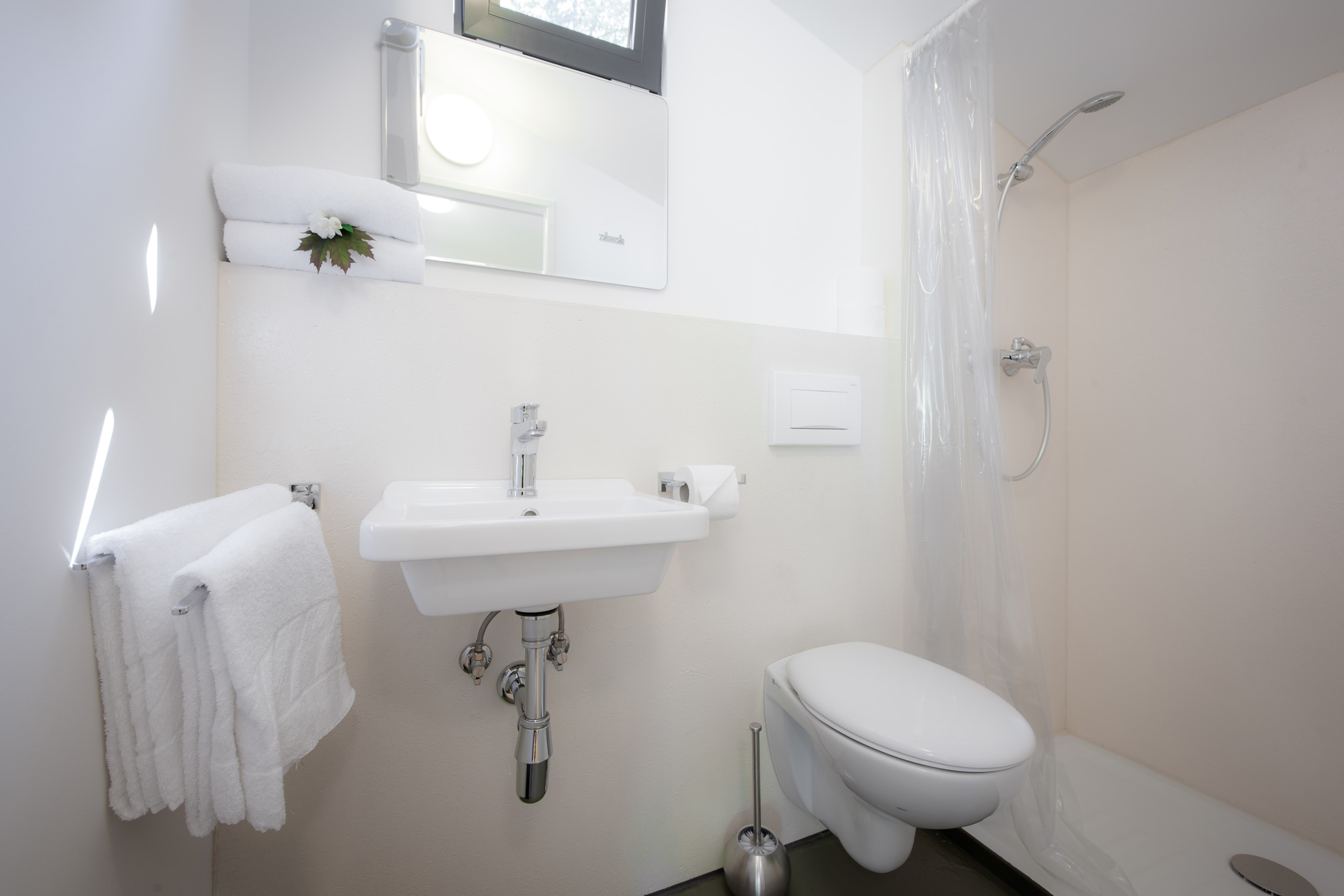 - Vsaka hišica ima kopalnico z umivalnikom, tušem in WCjem
