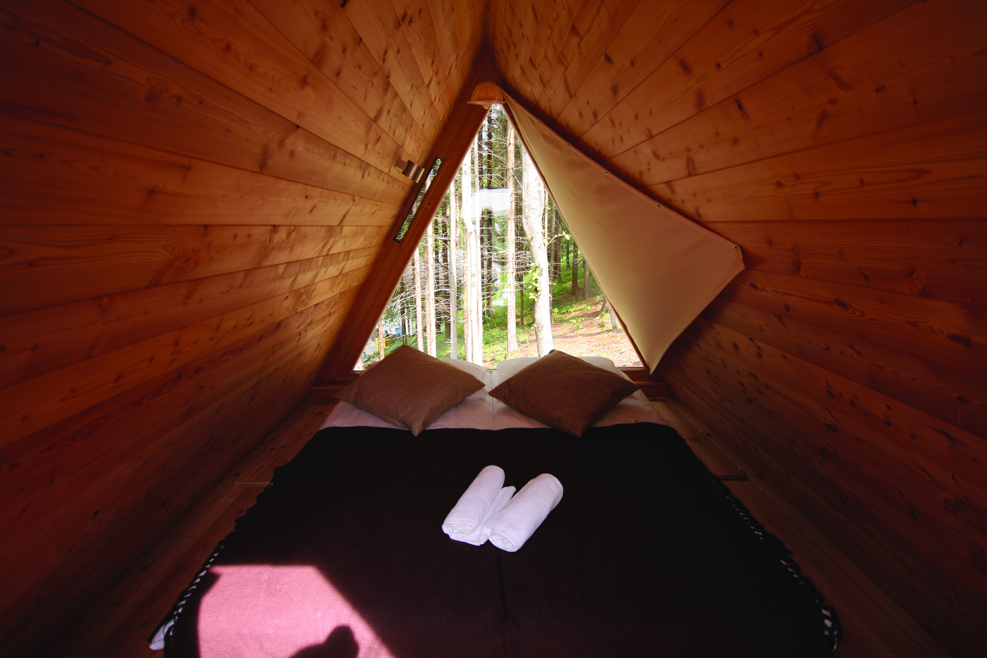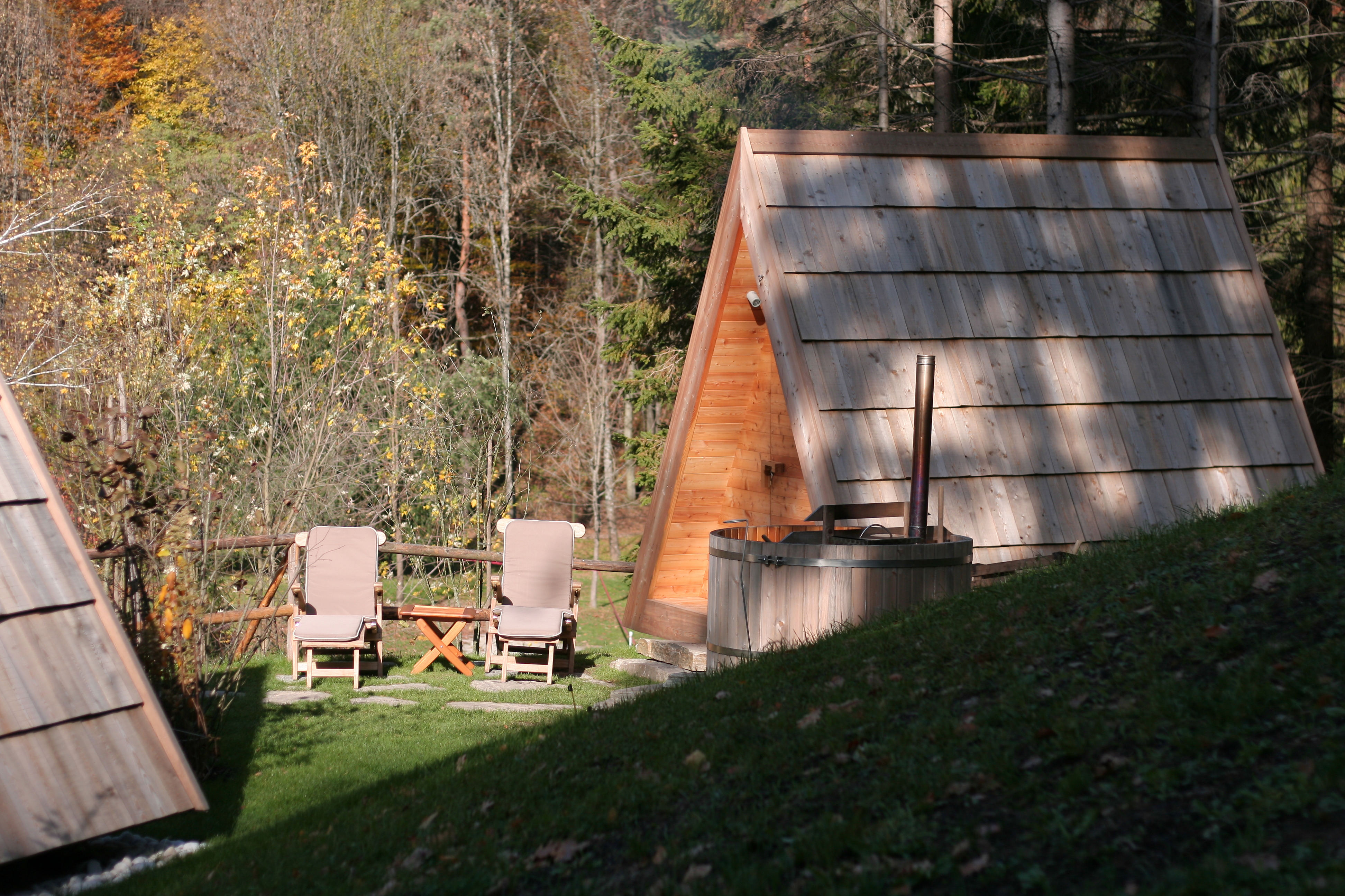 V ljubkih lesenih hišicah spanje v naravi dobi nov pomen. Hiške so zgrajene iz ekološkega neobdelanega macesnovega lesa in krite z macesnovimi skodlami. Udobna postelja je narejena iz povsem naravnih materialov. V hišici diši po lesu. Pred hišico vas vabijo lepo urejena okolica s tipičnim alpskim rastlinjem, lesena kad z ogrevanjem na drva in udobni leseni ležalniki. Pobegnite vsakodnevni rutini in si privoščite oddih v dvoje v Glampingu Gozdne vile!