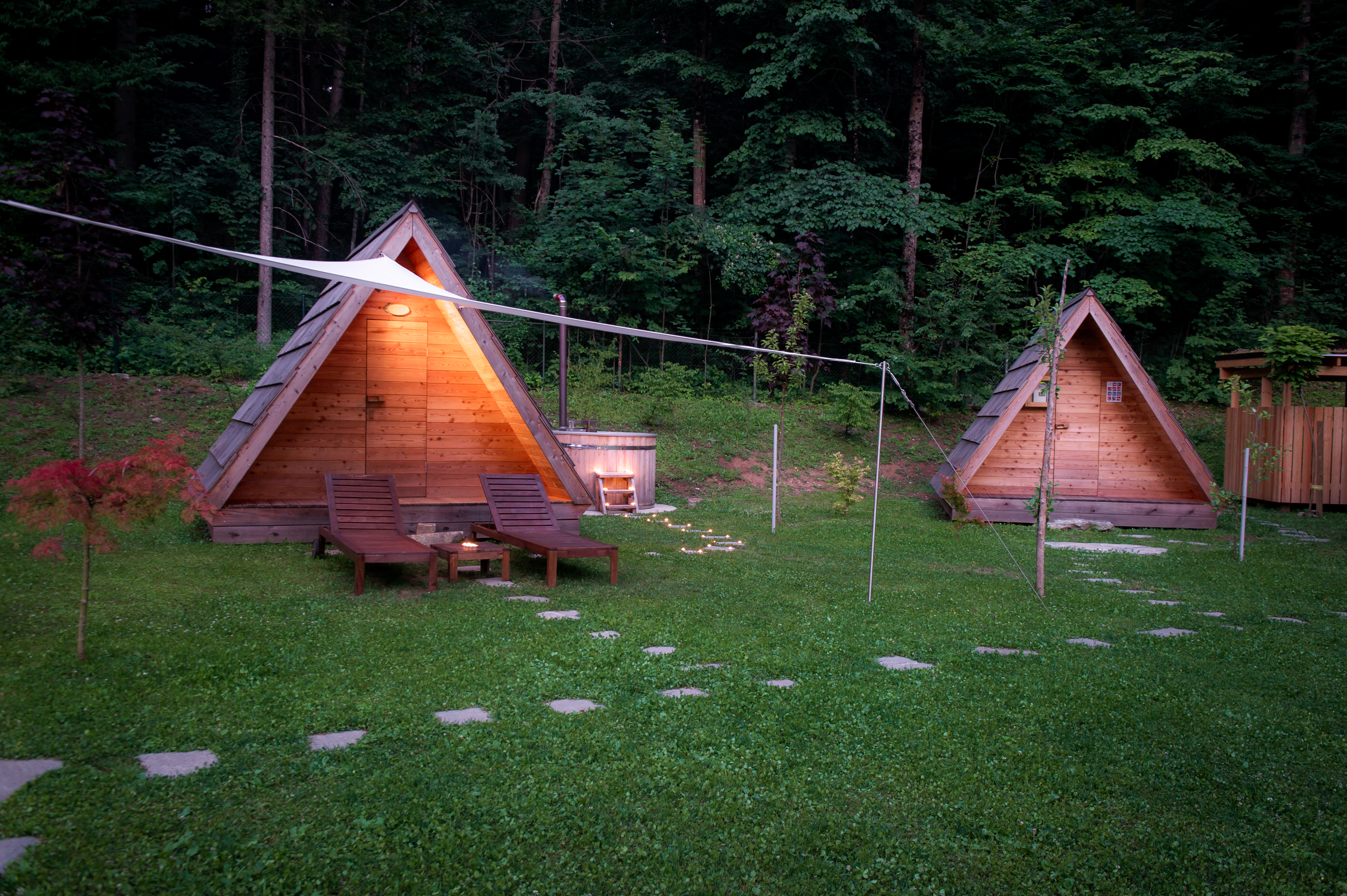 Pričakuje vas 12 lesenih glamping hišk, vsaka z urejenim zunanjim prostorom z udobnimi ležalniki in senčno ponjavo. Nekatere od hišk imajo tudi ogrevane zunanje kadi za romantične trenutke pod zvezdnim nebom.