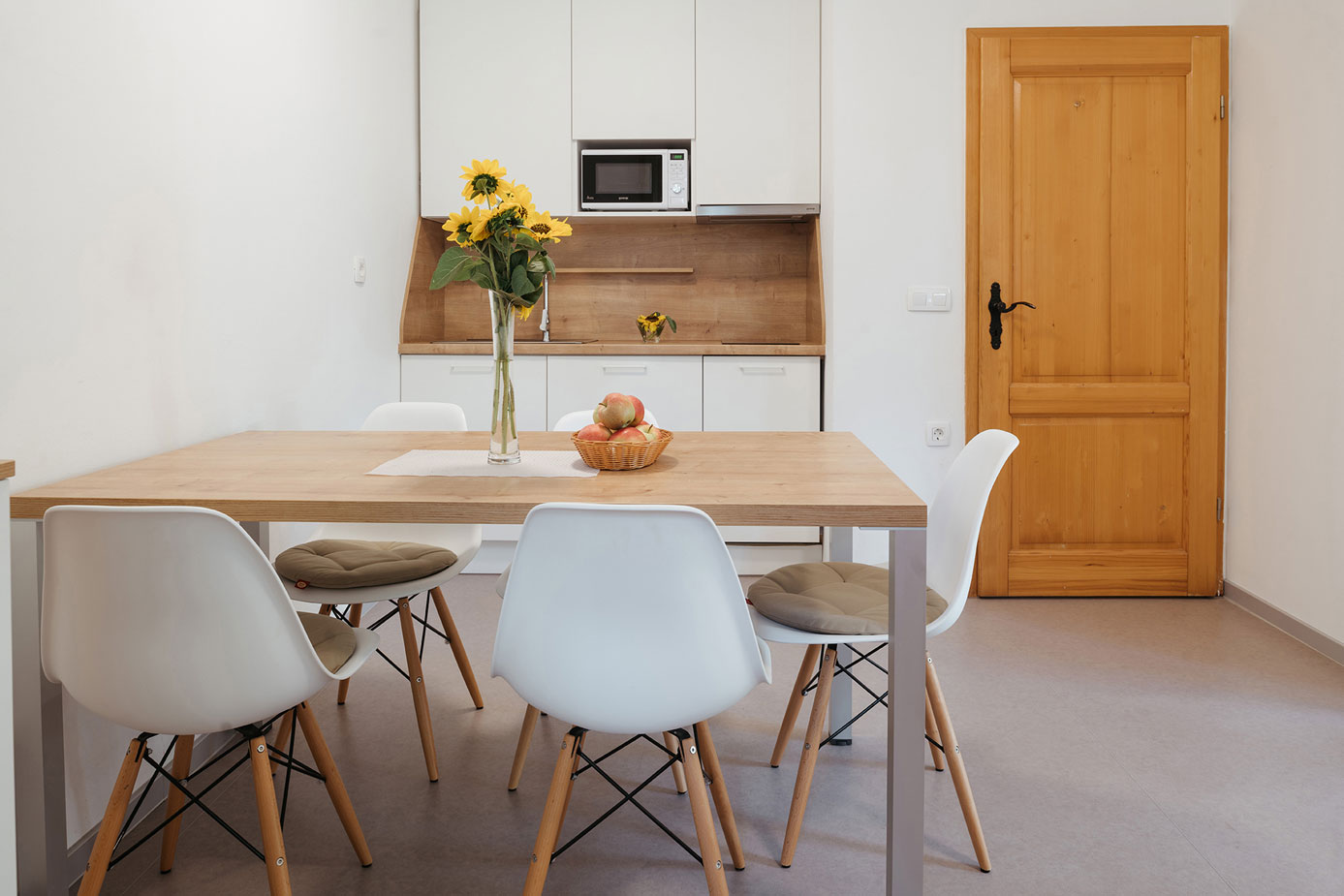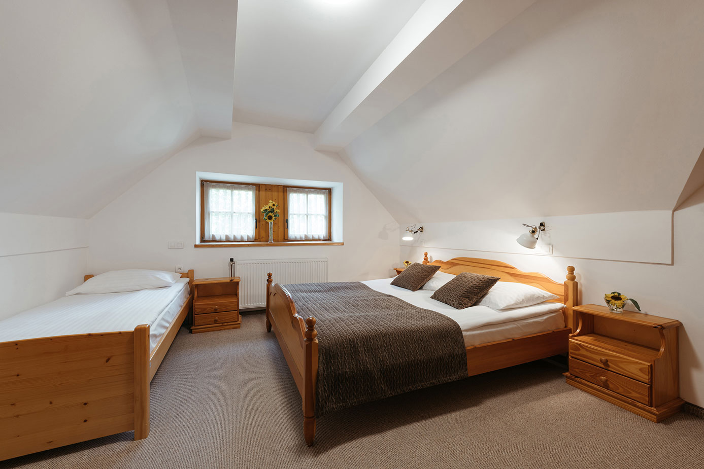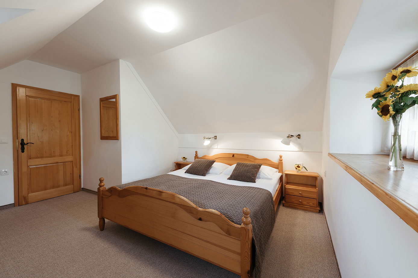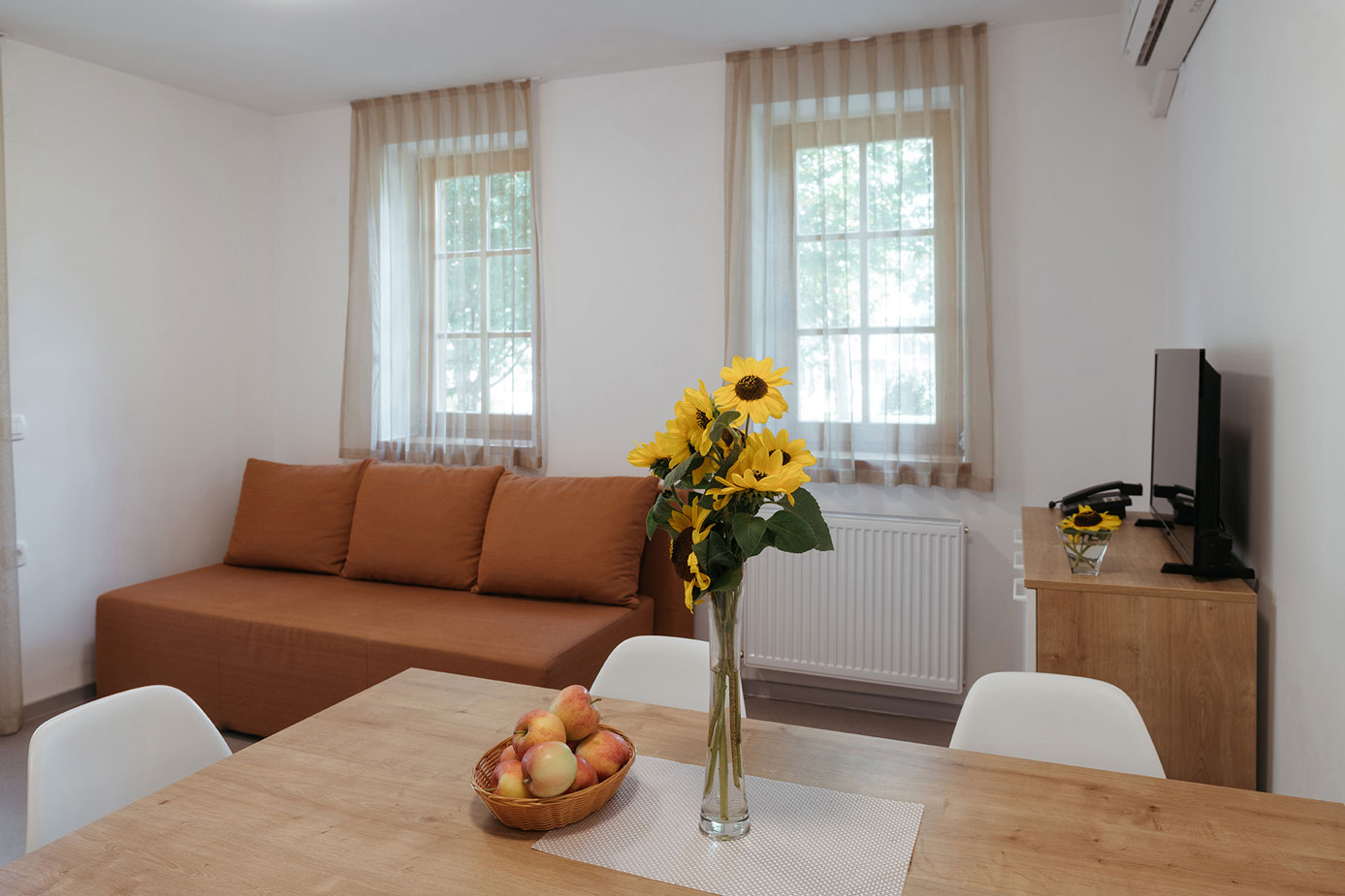 Prostoren in udoben apartma za pet oseb z dvema spalnicama z zakonsko posteljo 200 x 180 v zgornjem nadstropju. V eni spalnici je še dodatno ležišče. V apartmaju (80 m2) je kopalnica s tušem in WC-jem v zgornjem nadstropju. V spodnjem nadstropju se nahaja dnevni prostor s kuhinjsko nišo, WC-jem in teraso.