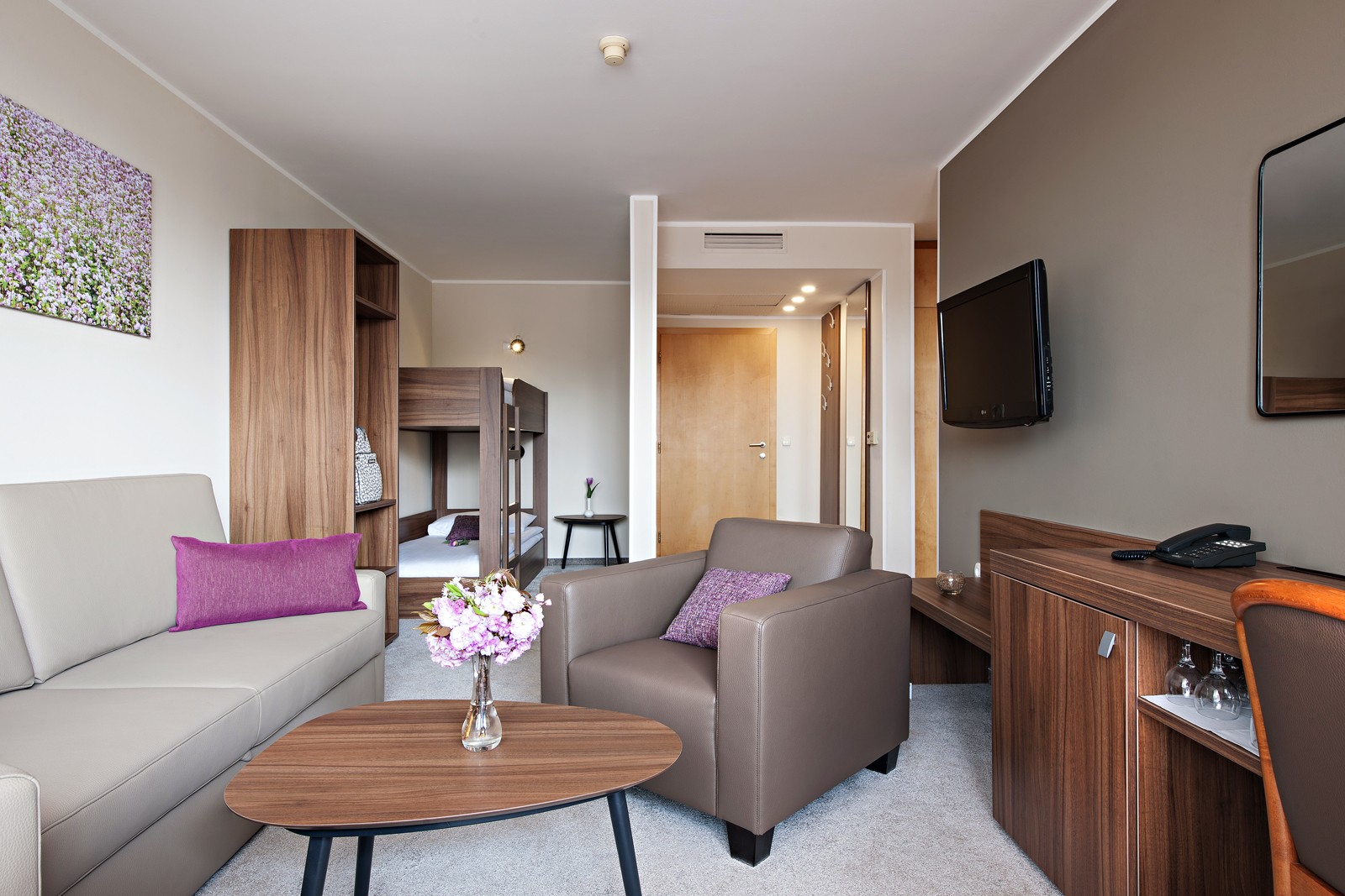 Udobna suita z zakonskim ležiščem (180 cm) in pogledom na park. V sobi veliki 50 m2, z dvema prostoroma, je kopalnica s tušem, ločen WC, v dnevnem prostoru pisalna miza in trosed ter pograd v sobni niši, terasa.