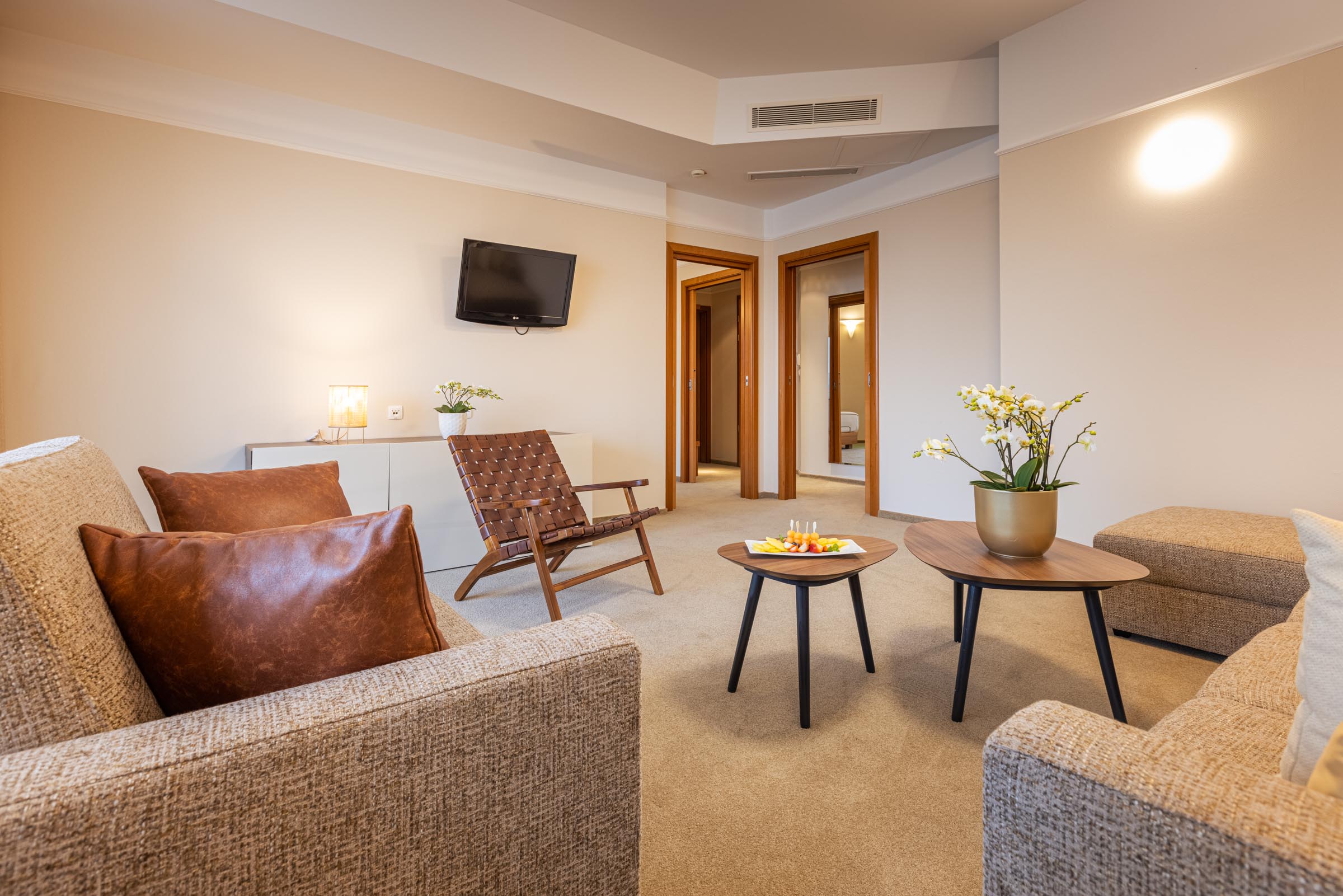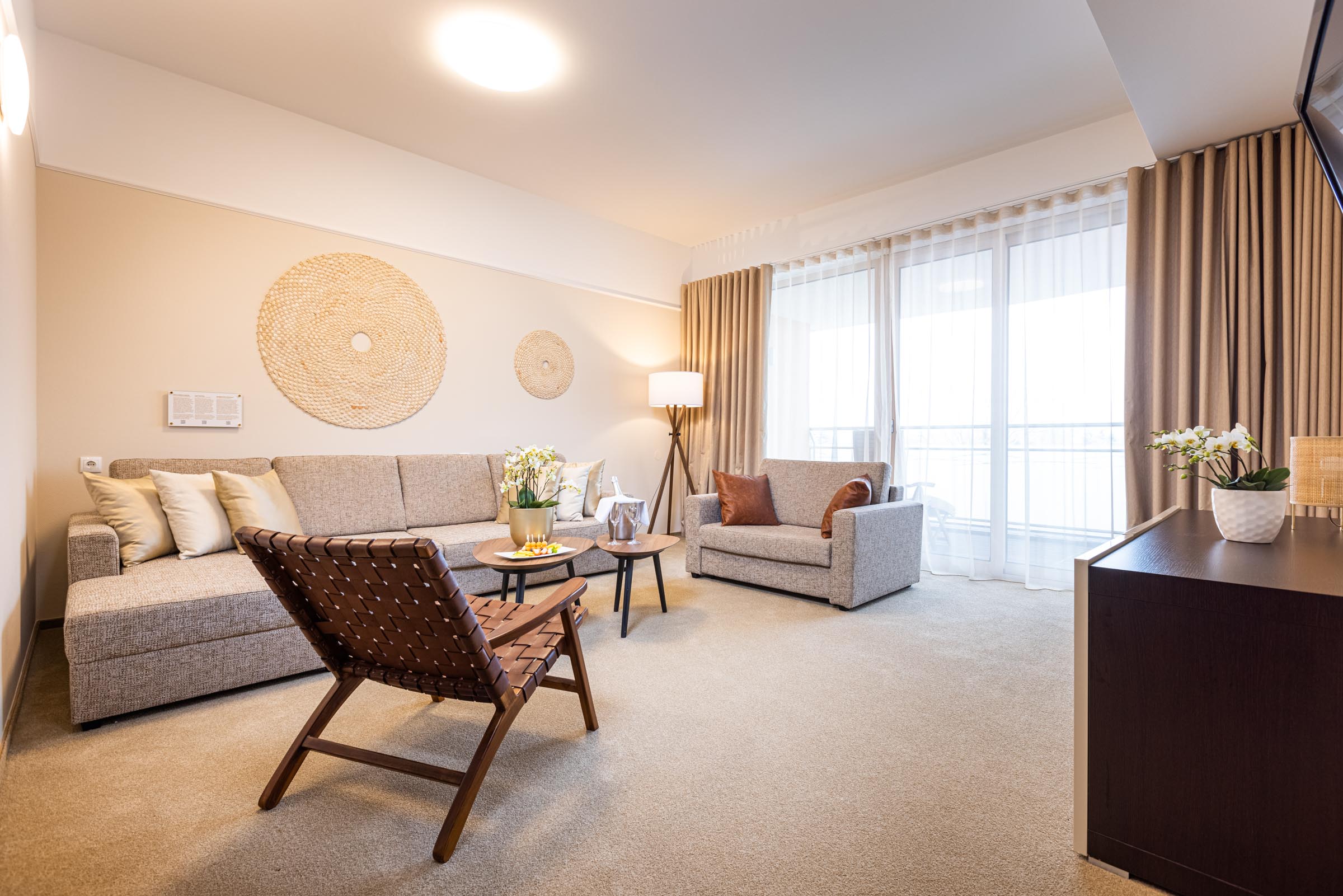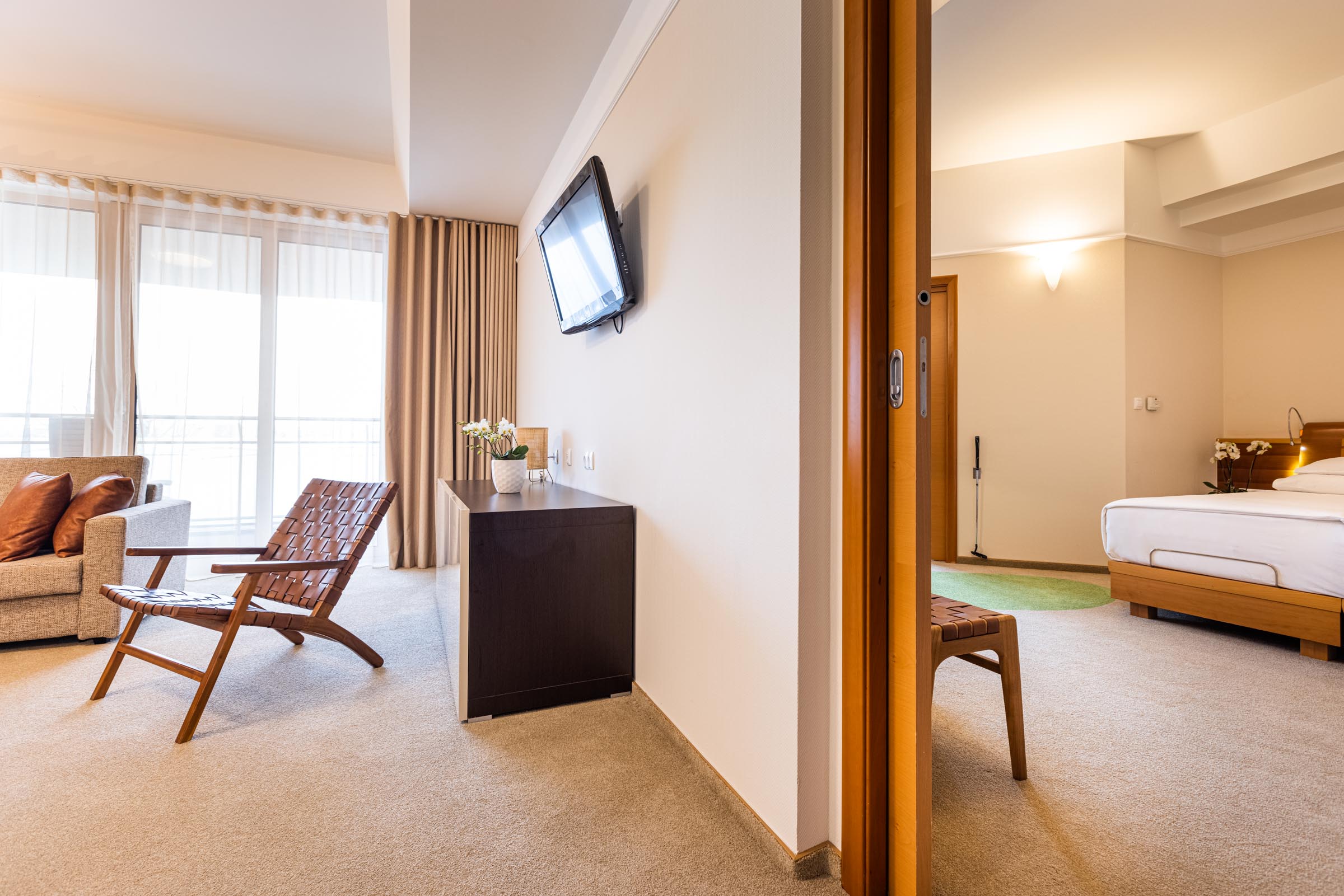 Elegantna in udobna suita z dvema ločenima prostoroma, zakonskim ležiščem širine 180 cm in balkonom z odličnim razgledom. V sobi (57 - 65 m2) je kopalnica s kadjo s termalno in običajno vodo, ločen tuš in WC, pisalna miza ter sofa.