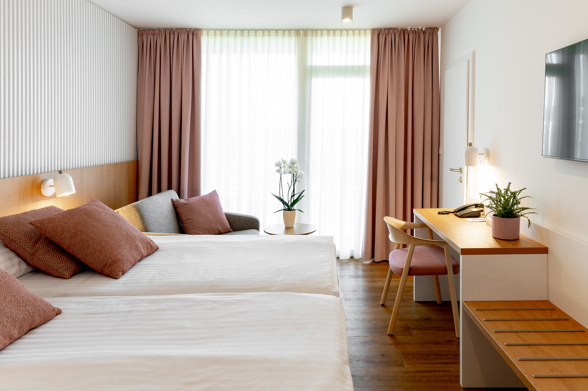 Udobna dvoposteljna soba z ležiščem širine 180 cm ali ločenima ležiščema širine 90 cm. V sobi (20 m2) je kopalnica s tušem in WC-jem, pisalna miza ter dvosed.