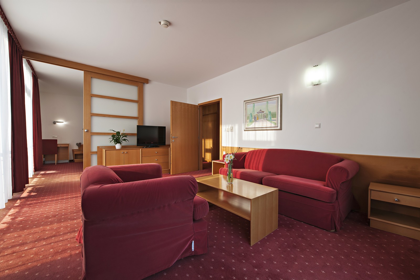 Udobna dvoposteljna soba z ležiščem širine 180 cm in pogledom na park. V sobi (28,80 m2) je kopalnica s tušem in WC-jem ter pisalna miza.