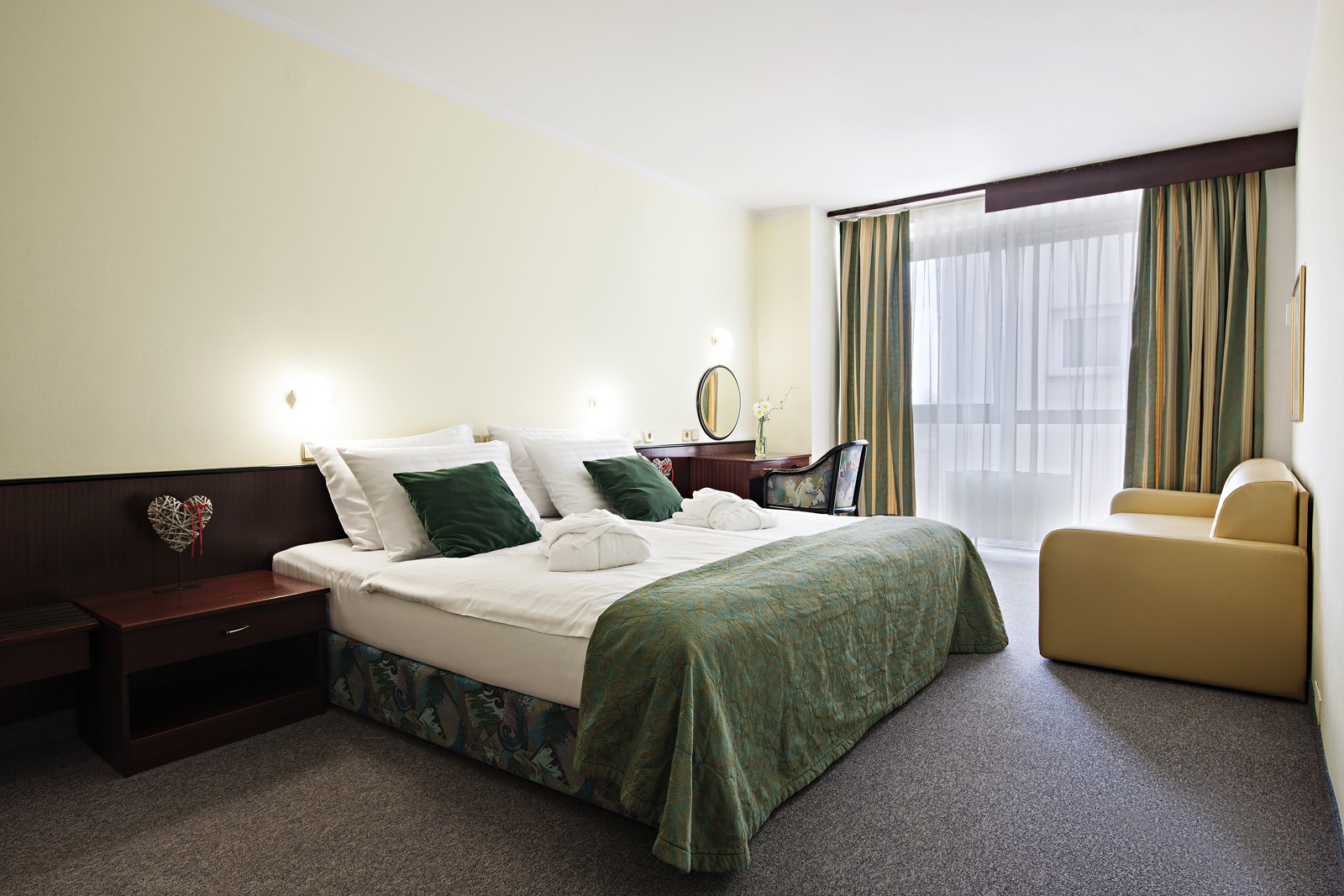 Udobna suita z ležiščem širine 180 cm ali ločenima ležiščema širine 90 cm in balkonom s pogledom na park. V sobi (60 m2) je kopalnica s kadjo in WC-jem, pisalna miza in dvosed.