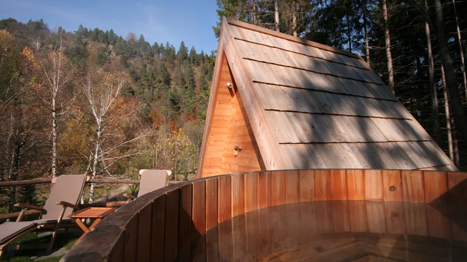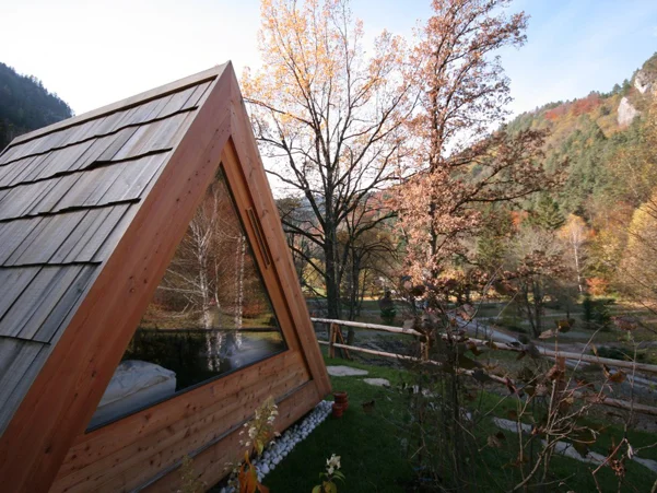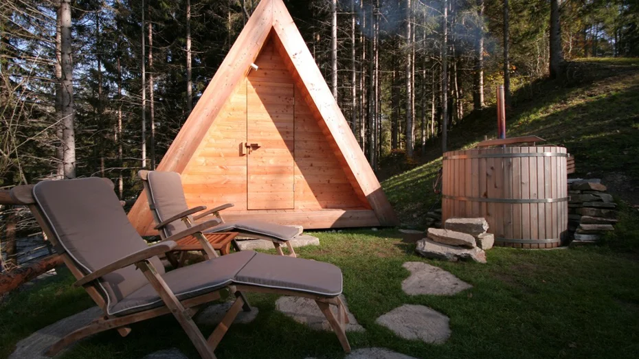 Die bezaubernden kleinen aus Holz gefertigten Campinghäuschen sind die richtige Wahl, wenn Sie zu zweit der Alltagsroutine entfliehen möchten. Das Übernachten in der Natur erhält hier eine ganz neue Bedeutung. Die Häuschen sind aus ökologischem unbehandeltem Lärchenholz gefertigt, und das Dach ist mit Lärchenschindeln eingedeckt. Das komfortable Bett wurde komplett aus natürlichen Materialien gefertigt. Im Häuschen ist ein angenehmer Duft von Holz zu verspüren. Vor dem Häuschen tragen eine gepflegte Umgebung mit für die Alpenregion typischen Pflanzen, einem Holz-Badebottich mit Holzbeheizung sowie mit komfortablen Liegestühlen aus Holz zu Ihrem Wohlbefinden bei.