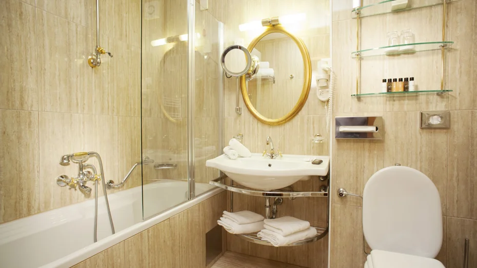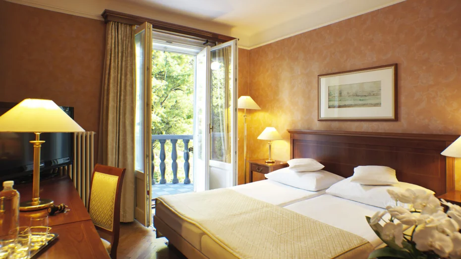 Elegantes Doppelzimmer mit Balkon in einem für das Hotel charakteristischen traditionellen und luxuriösen Stil. Im Zimmer (22-25 m²) befindet sich ein Bett der Größe 180 cm, ein Badezimmer mit Badewanne oder Dusche und WC sowie ein Schreibtisch.