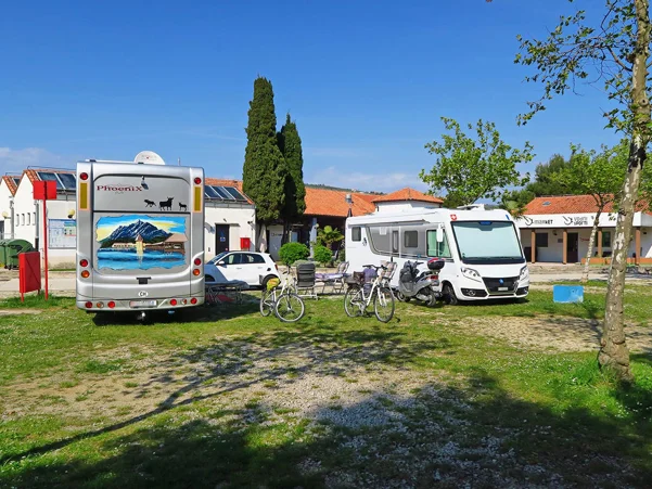 - Die Stellplätze sind auf einer mit Gras bewachsenen Fläche, nahe am Meer eingerichtet.