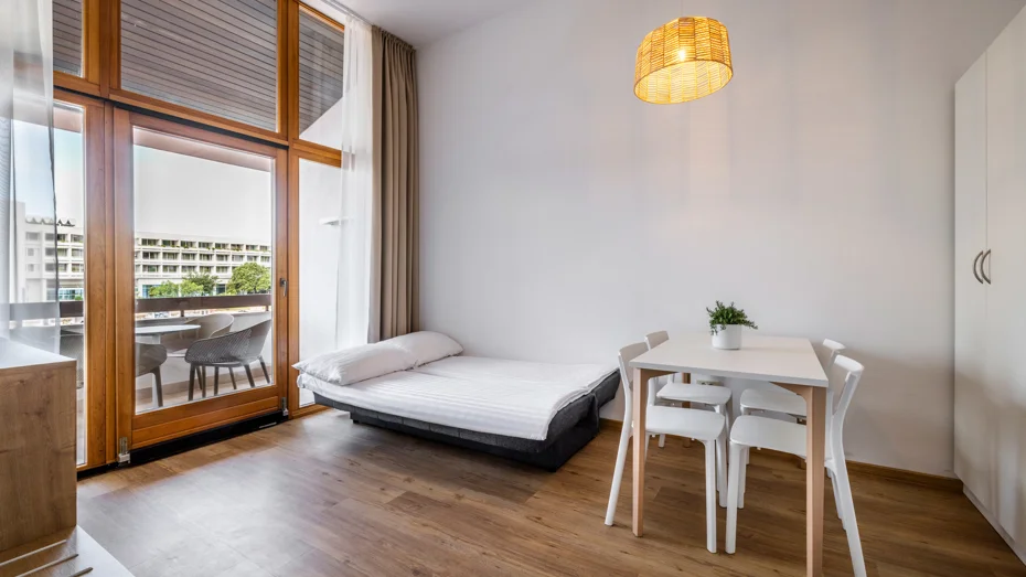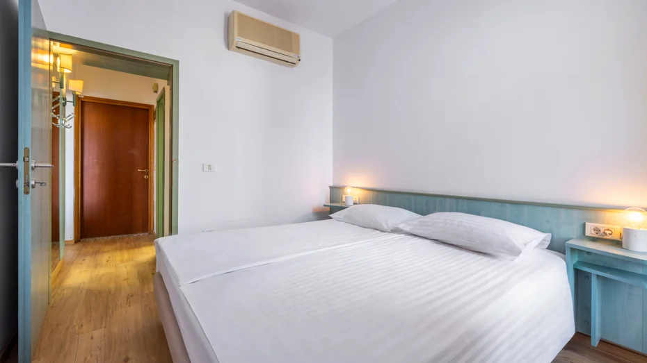 Unabhängige und komfortable Suiten, teilweise mit Blick auf das Meer und teilweise mit Blick auf die Einkaufsstraße. Angebot in Wohnungen: Schlafzimmer, Wohnzimmer mit Schlafcouch, Küche, Kabel-TV, Telefon, Badezimmer mit Dusche, Haartrockner, Klimaanlage, Balkon. Größe der Wohnungen: 39 m2 Bettgröße: 1 Doppelbett 160 x 210 cm und 1 Schlafsofa oder Zustellbett 100 x 200 cm