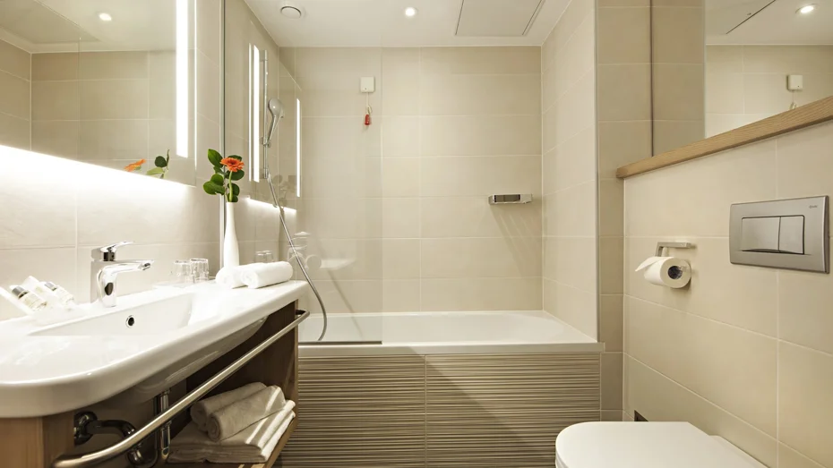 Renovated, spacious double room with balcony and lake view. The 22-26 m2 room with twin beds 90 cm wide or a double bed 180 cm wide features a writing desk, a pull-out armchair (as an additional bed measuring 70 x 190 cm), a kettle for tea or coffee, free Wi-Fi access, and a bathroom with a bathtub or shower and toilet. All rooms were renovated in April 2017 using natural material from the neighbouring Slovenian towns.