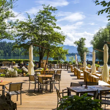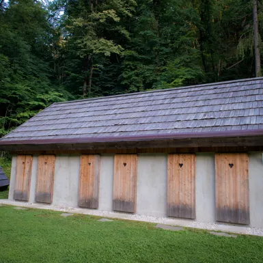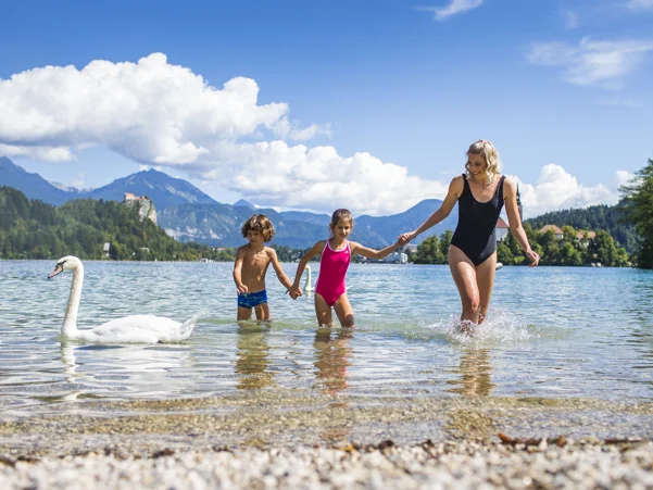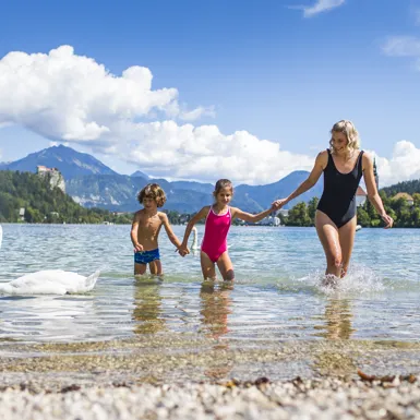 Swim in Lake Bled! The Velika Zaka Beach with a restaurant and bar is located at the edge of the campsite. Bathers can also bathe at the Castle bathing area. In the colder months, you are invited to Waterpark Wellness Živa in the Rikli Balance Hotel, which offers thermal pools and an indoor slide.