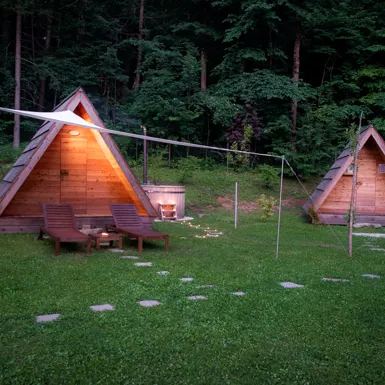 Sleeping in nature takes on a new meaning in our lovely wooden huts. The huts are made of unprocessed larch wood and covered with larch shingles. The comfortable bed is made entirely from natural materials. The smell of wood pervades the entire hut. In front, you will find beautifully landscaped surroundings with typical Alpine plants, a wooden bathtub heated by firewood and comfortable wooden patio chais lounges. Escape the everyday routine and treat yourself to a vacation for two in Glamping Gozdne vile!