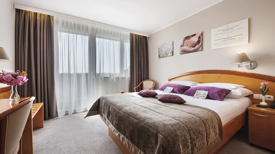 Economy room ( 15,5 m2 ) with a 150 cm wide queen-sized bed and balcony with a view of the park. The room features a bathroom with shower and toilet as well as a desk and sofa chair.