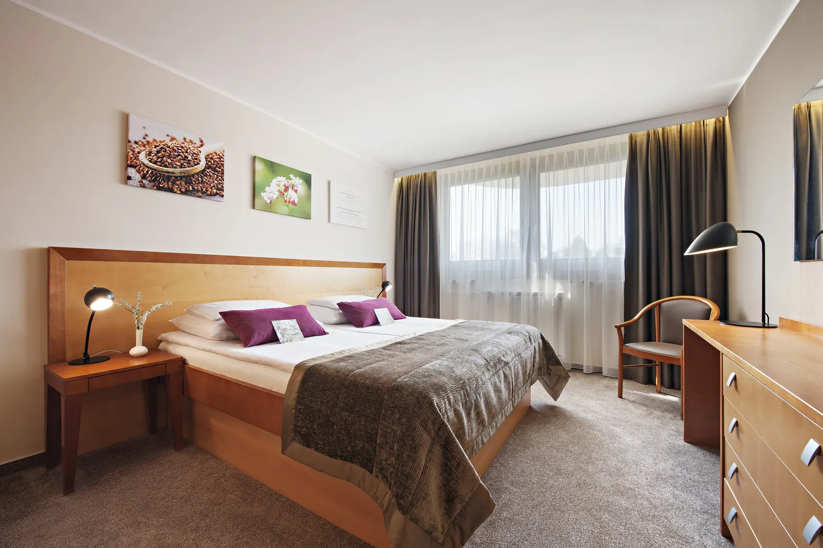 Comfortable suite with a double bed (180 cm wide) and park view. The 50 m2 two-room suite features a bathroom with shower, a separate toilet, a living room with a writing desk, three-seater and bunk bed in a niche, and a terrace.