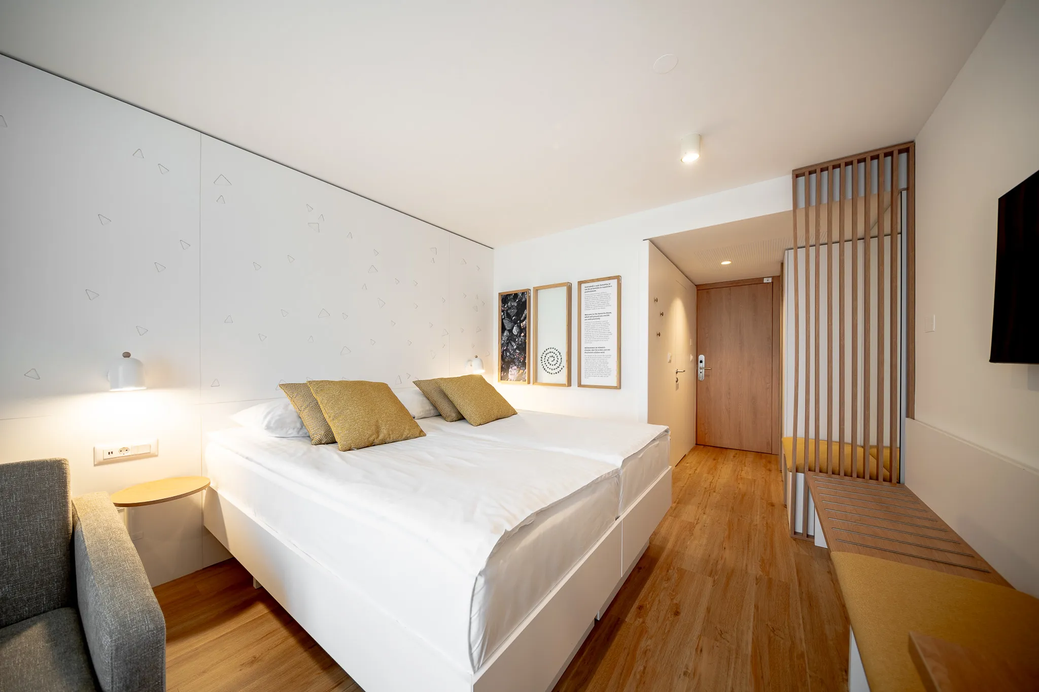 Elegant double room with a 180 cm wide bed or two separate 90 cm wide beds. The room (20 m2) features a bathroom with shower and toilet as well as a desk and two-seater sofa.
