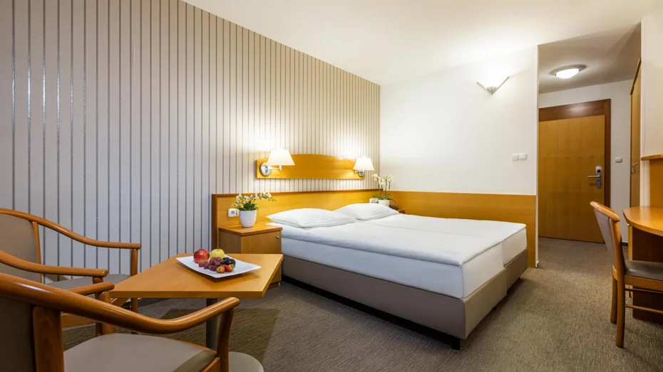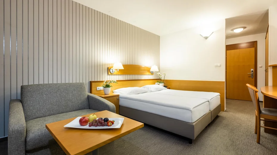 Comfortable double room with a 180 cm wide bed or two separate 90 cm wide beds with a view of the park. The room (20 m2) features a bathroom with bathtub, shower and toilet as well as a desk and two-seater sofa.