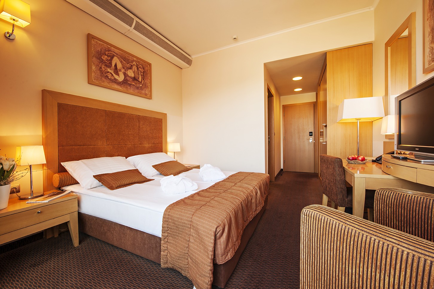 Elegant and comfortable double room with a 160 cm wide queen-sized bed and balcony. The room (20 m2) features a bathroom with shower and toilet as well as a desk and chair.