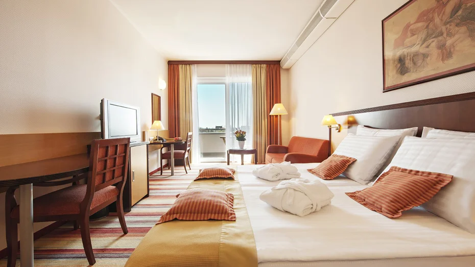Elegant and comfortable suite with a 180 cm wide bed or two separate 90 cm wide beds and balcony. The room (33 m2) features a bathroom with a corner bathtub and toilet as well as a desk and couch.