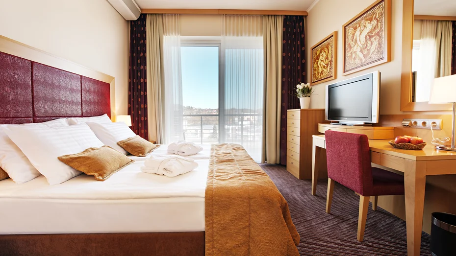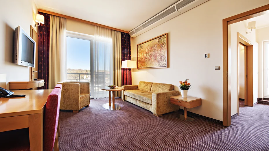 Elegant and comfortable suite with two separate rooms, 180-cm double bed, and terrace with great views. The room (73.50 m2) has a bathroom with toilet, shower, private Finnish sauna, and whirlpool under a glass dome.