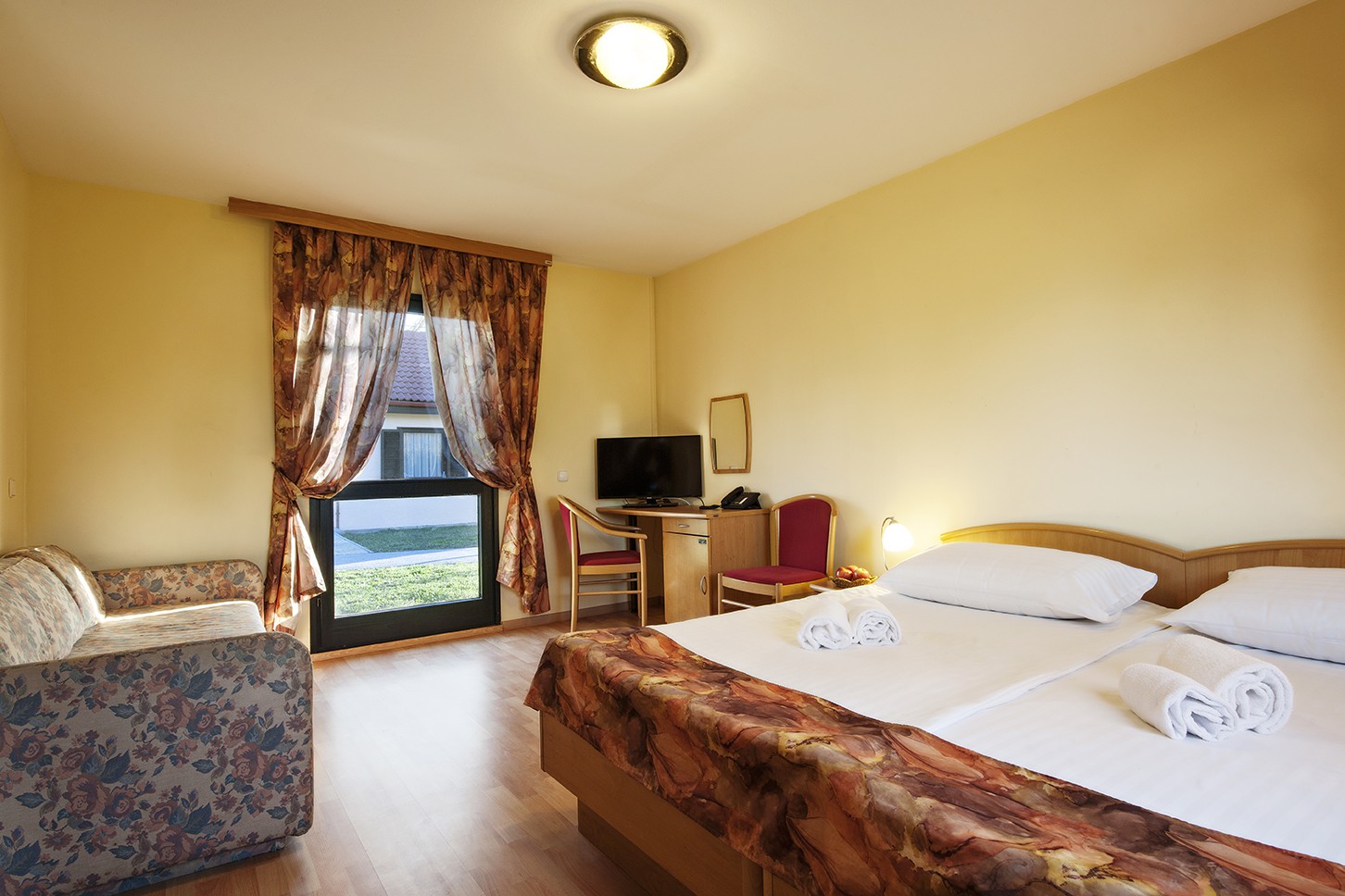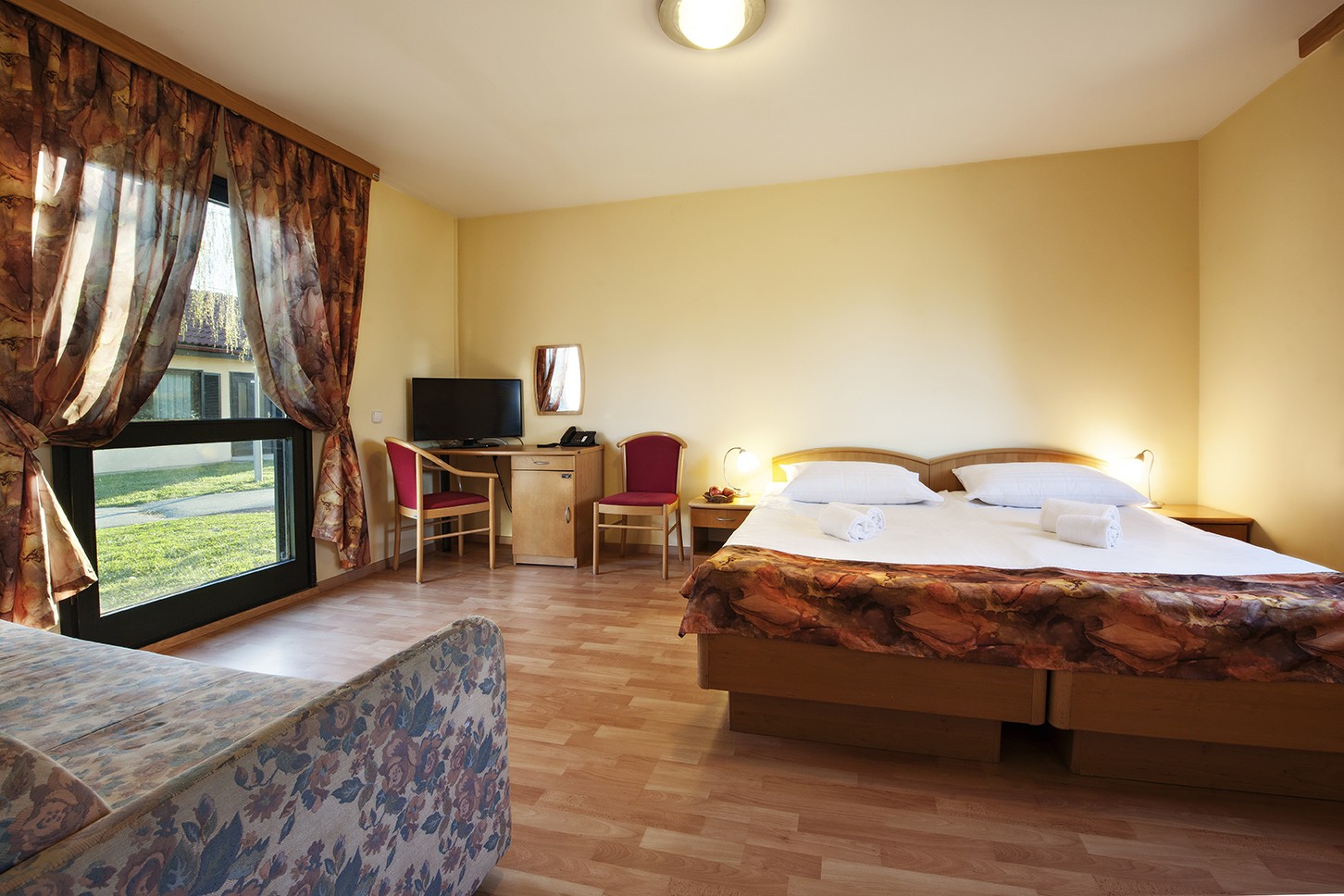 A comfortable 40 m2 bungalow with king size bed (width 180 cm) or two twin beds (width 90 cm). The room is furnished with a table, a sofa and offers a terrace with park view and ensuite bathroom with shower.