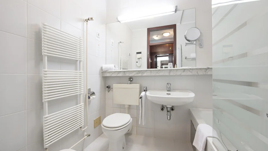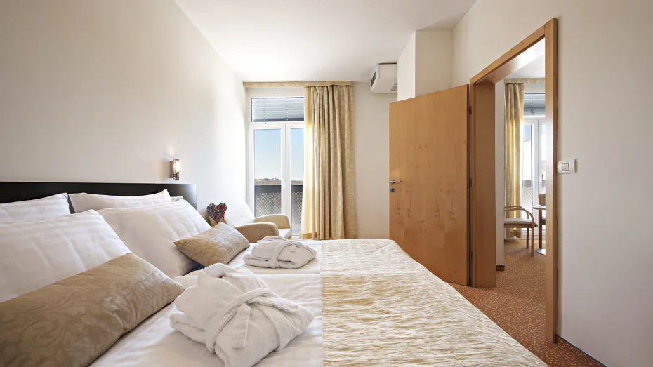 Comfortable suite with a 180 cm wide bed or two separate 90 cm wide beds and balcony with a view of the park. The room (60 m2) features a bathroom with shower and toilet as well as a desk and chair.