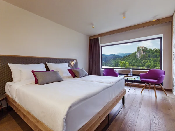 Na Bledu nas na svakom koraku oduševljava Bledsko jezero na koje se pruža prekrasan pogled ravno iz soba s tematikom vode, koje su umirujuće plave boje s valovitim elementima i zidnim slikama vode. Hotelske sobe s pogledom na park zato su umirujuće zelene, sa zidnih slikarija pozdravljaju slike šuma i drveća.