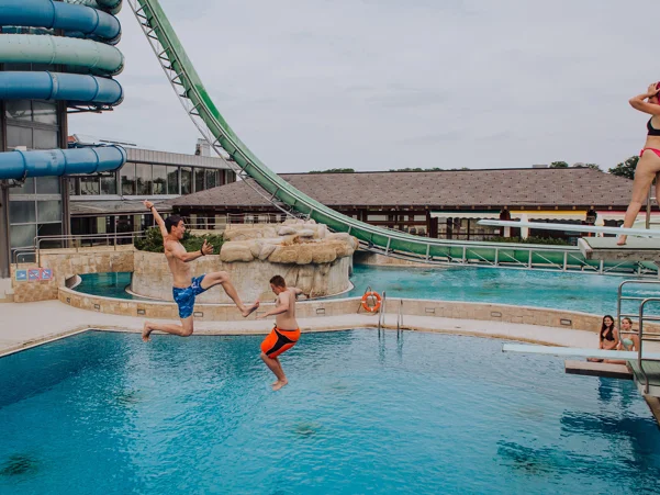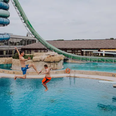 8 hotelskih bazena i kupališta: unutarnji termalni rekreacijski bazen, vanjski termalni rekreacijski bazen, unutarnja i vanjska kupka s crnom termomineralnom vodom, 2 unutarnje masažne kupke te unutarnji i vanjski dječji bazen s toboganom. Pokraj bazena nalazi se bar. Kupaći ogrtači dostupni su besplatno.