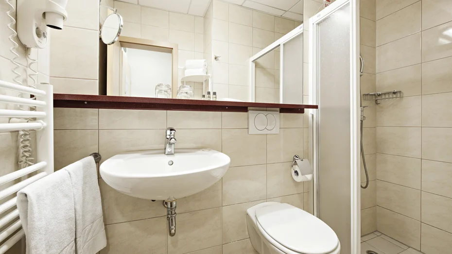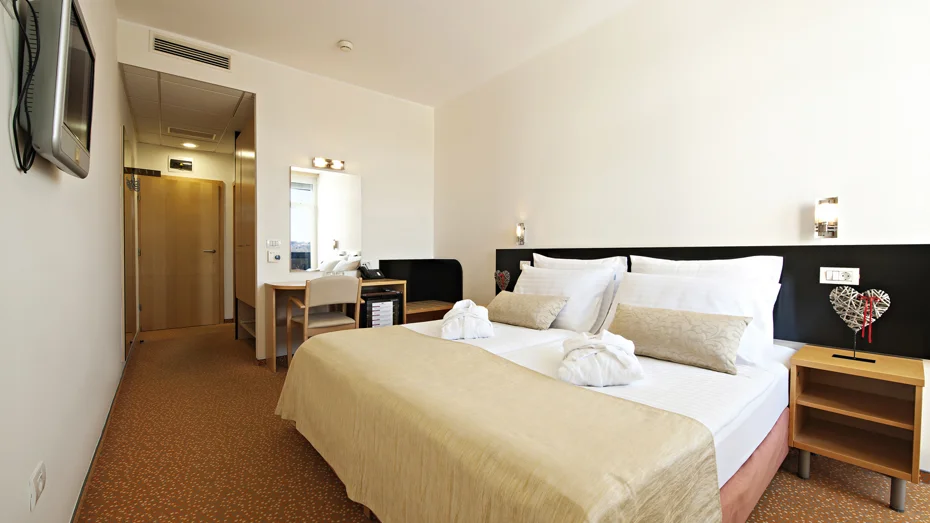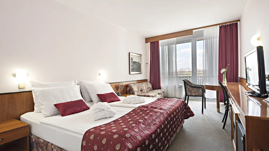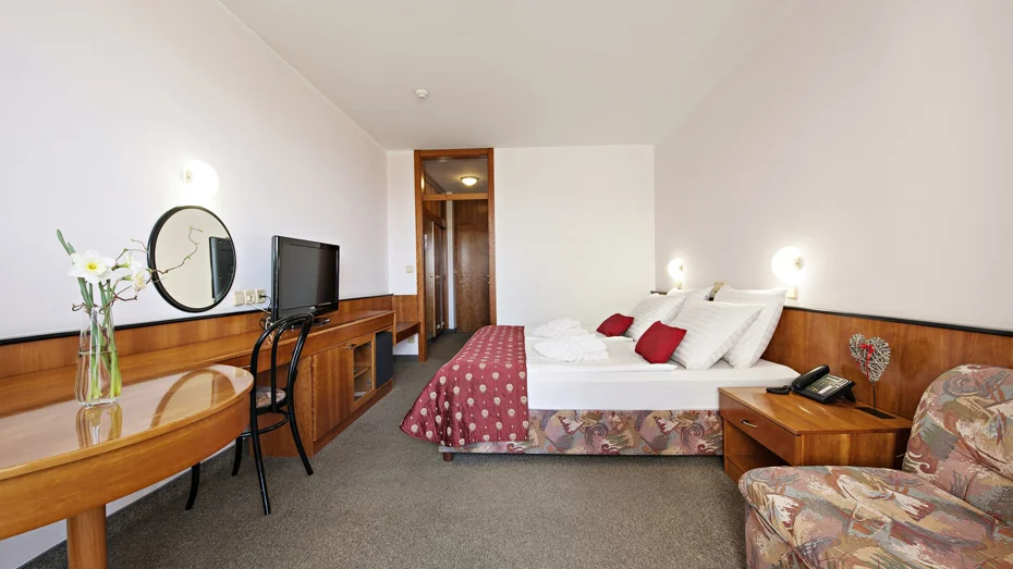 Udobna dvokrevetna soba s ležajem širine 180 cm ili odvojenim ležajevima širine 90 cm. U sobi veličine 23,5 m2 nalazi se kupaonica s kadom i WC-om, pisaći stol i jednosjed.