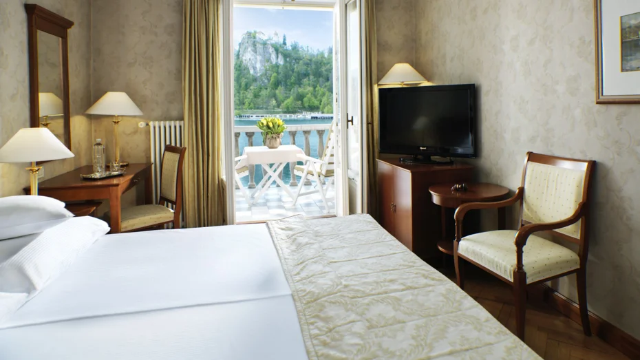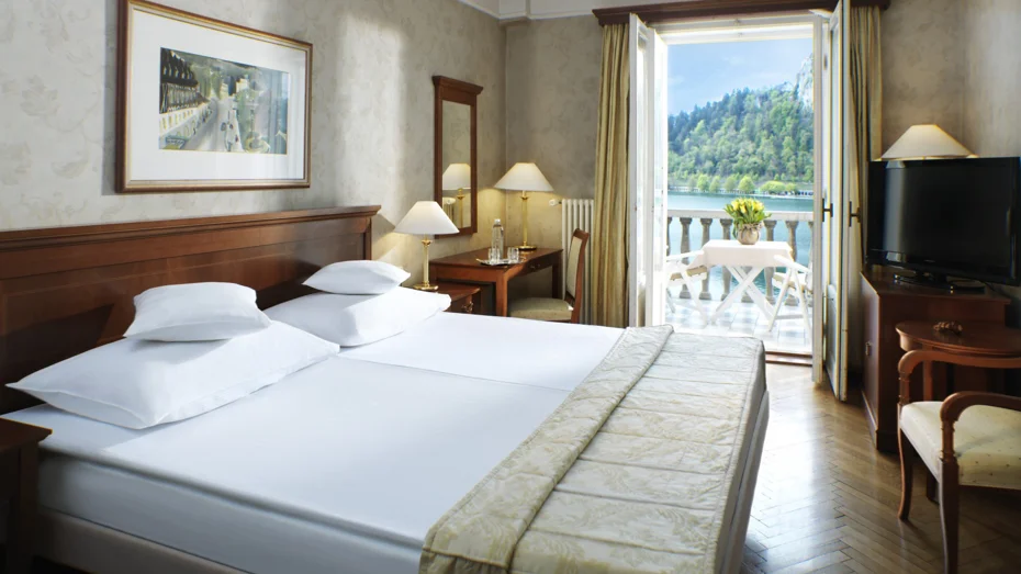 Elegante e confortevole camera doppia nel caratteristico e storico stile dell’albergo con balcone e vista sul lago di Bled. La camera da 22 a 25 m2 dispone di letto (180 cm), bagno con vasca o doccia, toilette e scrivania.