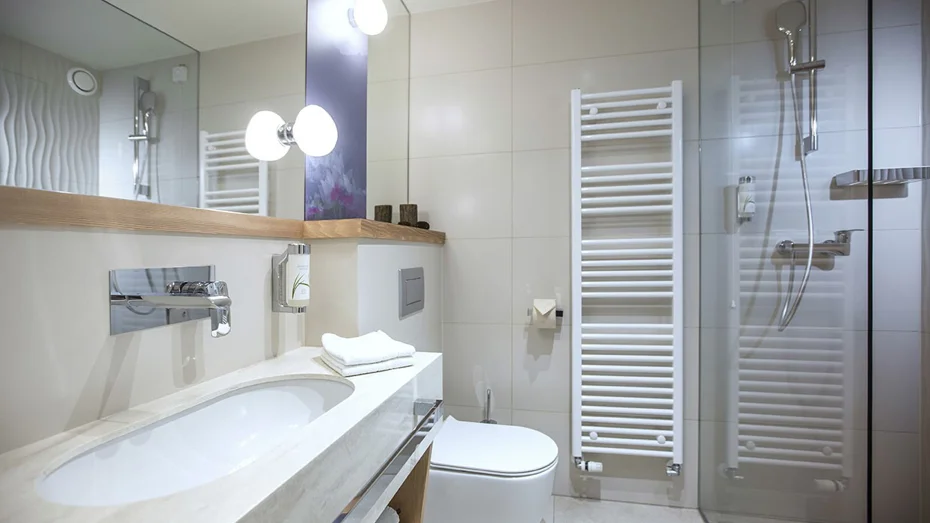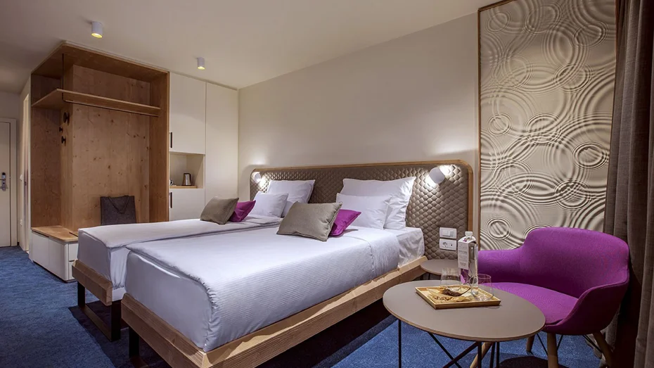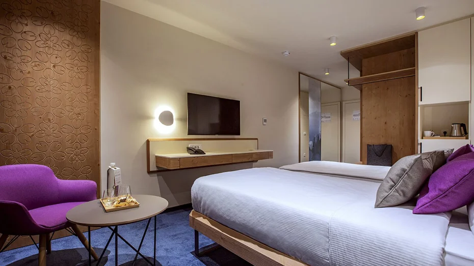 Confortevole camera doppia con balcone e vista sul lago. La camera da 20 m2 è dotata di due letti di 90 cm o di un letto di 180 cm e dispone di scrivania, accesso gratuito a internet Wi-Fi, bagno con vasca o doccia e toilette.