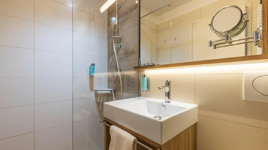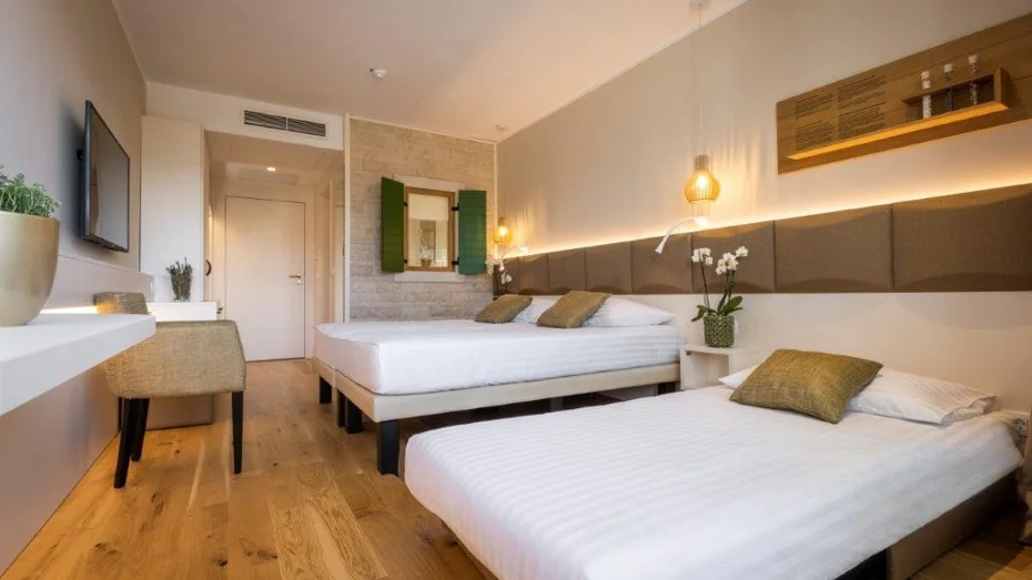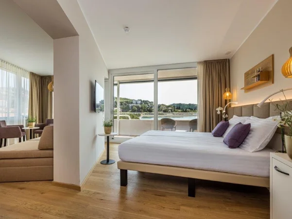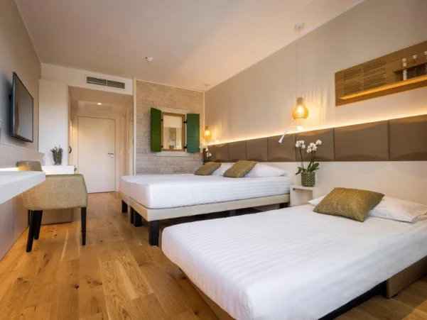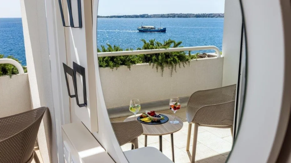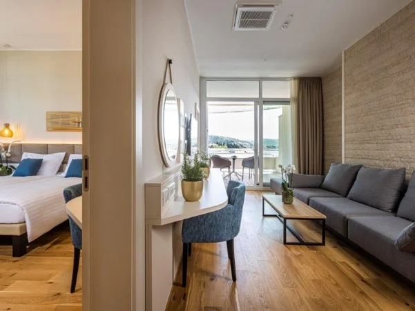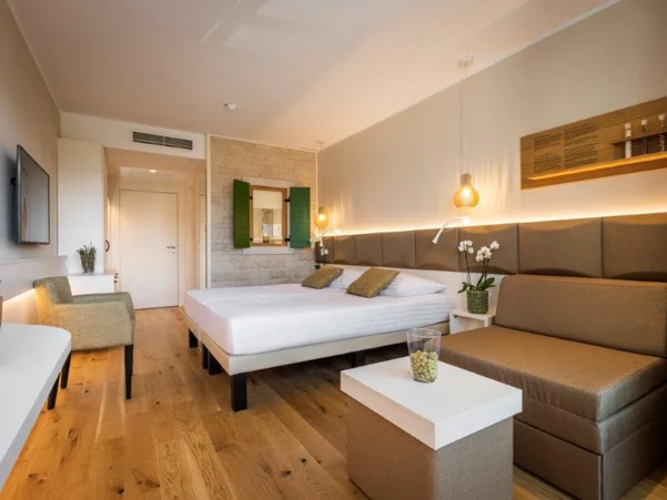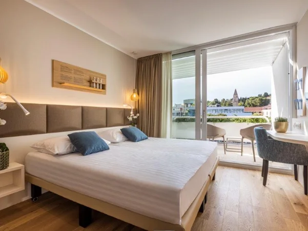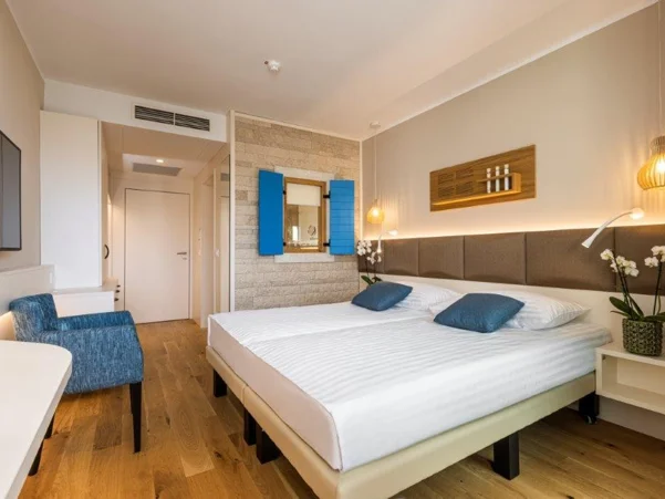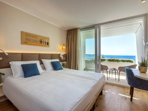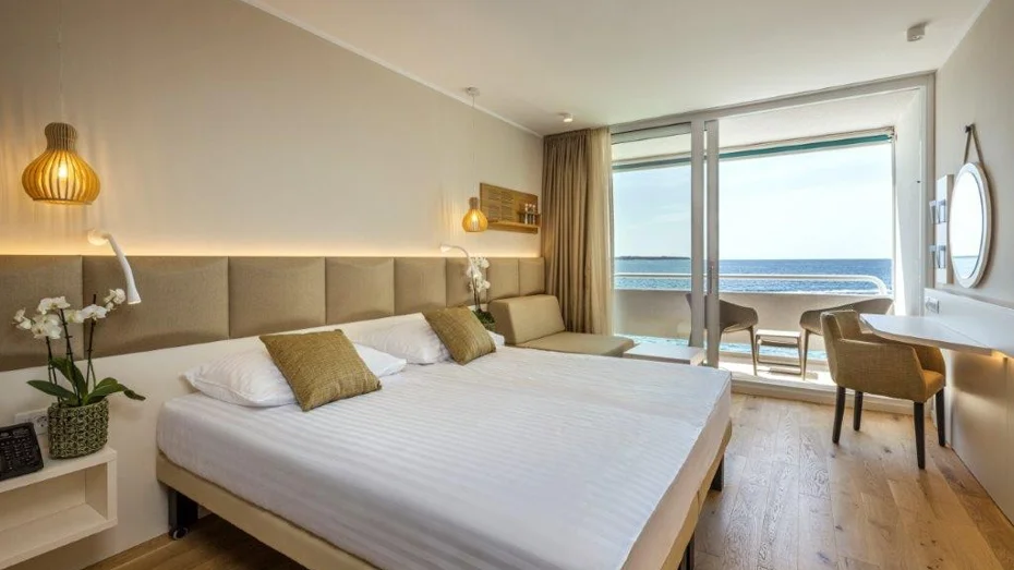 Camera doppia vista mare sul lato soleggiato. La camera offre: balcone, TV satellitare, telefono, radio, mini bar, aria condizionata, scrivania, bagno - doccia, asciugacapelli, set di cortesia pacchetto, minibar, cassaforte, servizio sveglia / sveglia. Dimensioni della camera: 24 m2 Dimensione Letti: 1 letto matrimoniale 160 x 200 centimetri + letto supplementare 90 x 200 centimetri. Questa camera può ospitare gratuitamente un bambino sul letto supplementare fino a 15 anni.