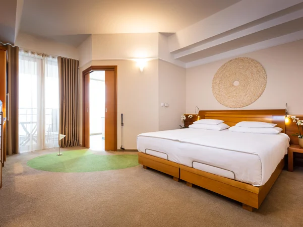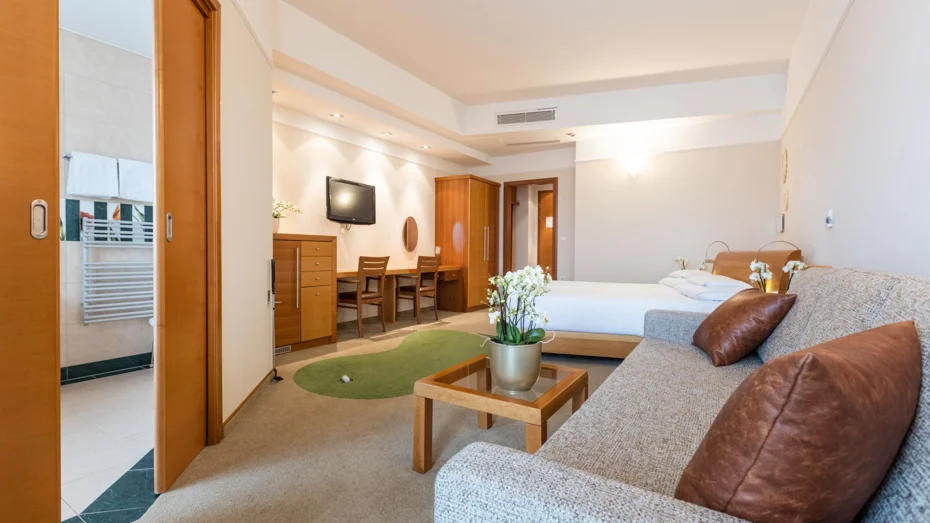 Controllate la disponibilitàElegante e confortevole camera doppia con balcone offre un letto di 180 cm o due letti separati di 90 cm. La camera di 38 m2 dispone di scrivania, divano, bagno con vasca e doccia con acqua sia termale che normale, bagno separato con doccia e toilette.