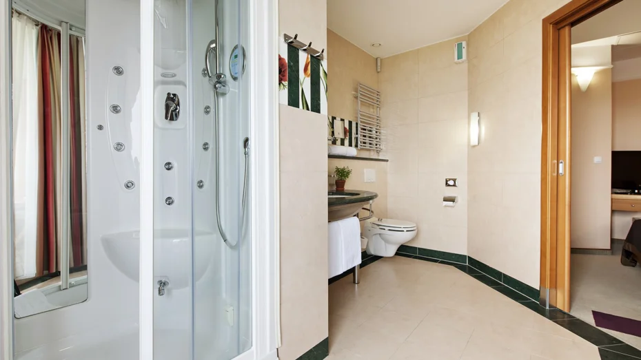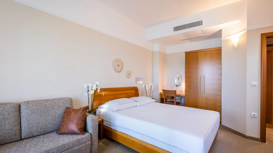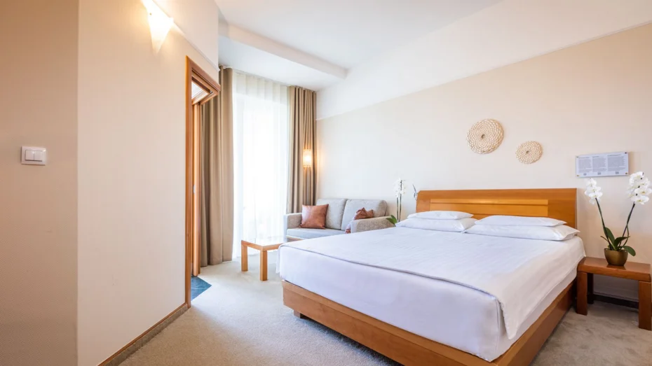 Elegante e confortevole camera doppia ( di 24 m2 ) con letto francese (150 cm) e vista sul parco. La camera dispone di bagno con doccia e toilette, balcone, scrivania e divano.