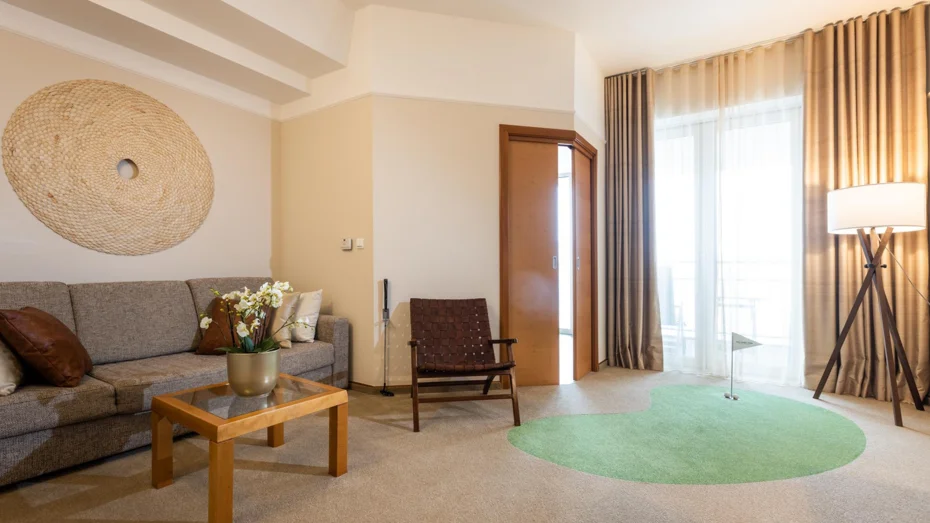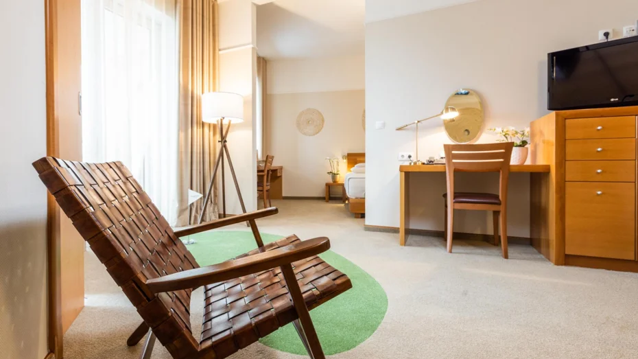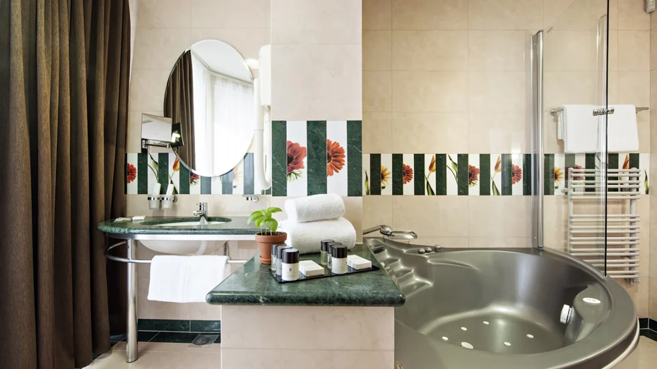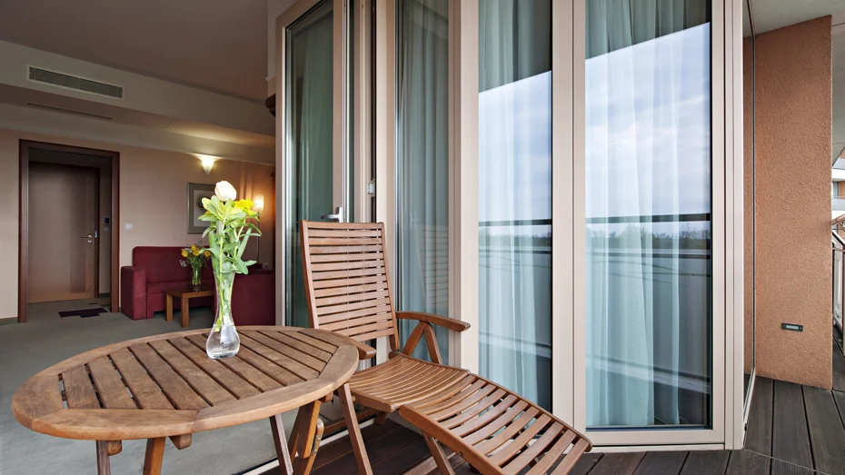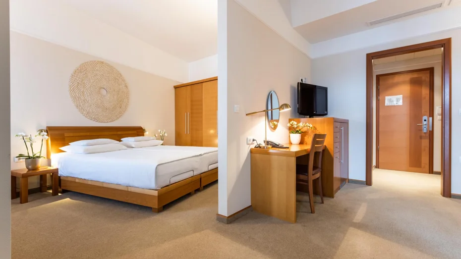 Elegante e confortevole suite con letto matrimoniale (180 cm) e vista. La camera di 39-49 m2 dispone di bagno con vasca e doccia con acqua sia termale che normale, bagno separato con doccia e toilette, balcone, scrivania e divano.