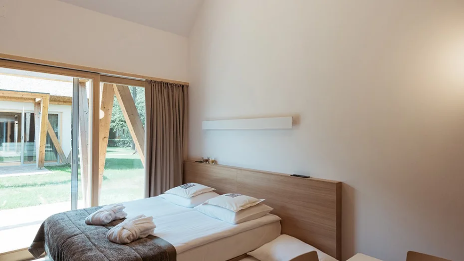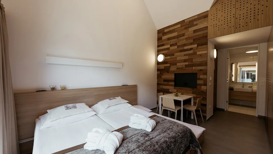 Casetta comoda e spaziosa con un letto largo 180 cm, un letto francese largo 140 cm al piano superiore e un letto supplementare largo 80 cm. La casetta (35,5 m2) è dotata di bagno con doccia e WC, tavola da pranzo e scrivania, letto supplementare e angolo cottura per preparare bevande calde. L’unità vanta anche una bellissima terrazza di fronte alla casetta.