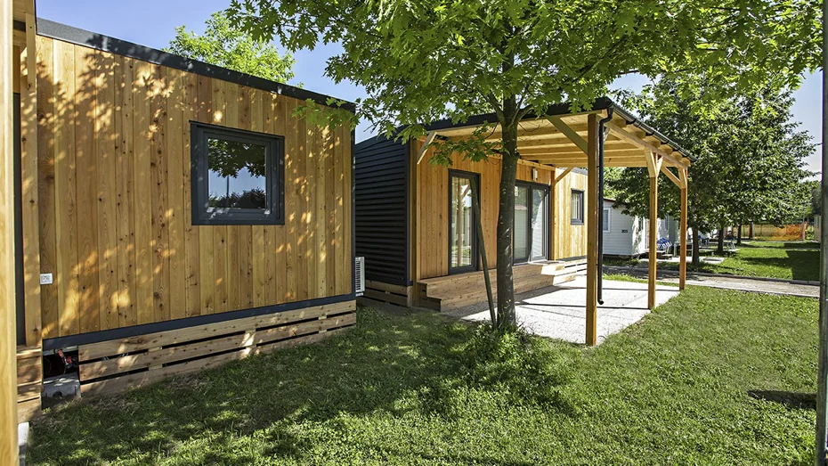 Comoda casa mobile per quattro persone con letto francese (160 cm), due letti separati (90 cm ciascuno) e vista sul parco. La casetta di 34 m2 dispone di bagno con doccia e toilette, terrazzo, tavolo da pranzo, divano biposto e angolo cucina.