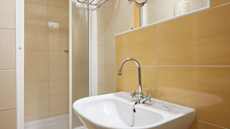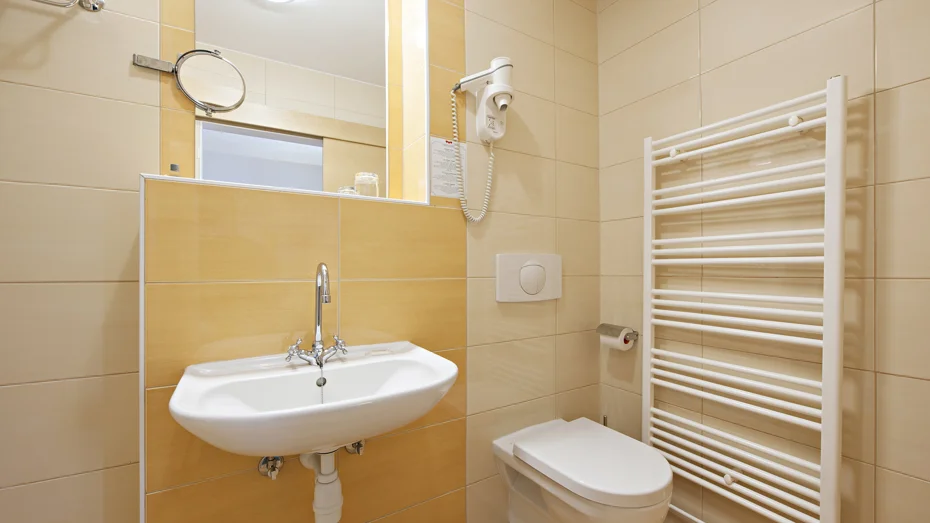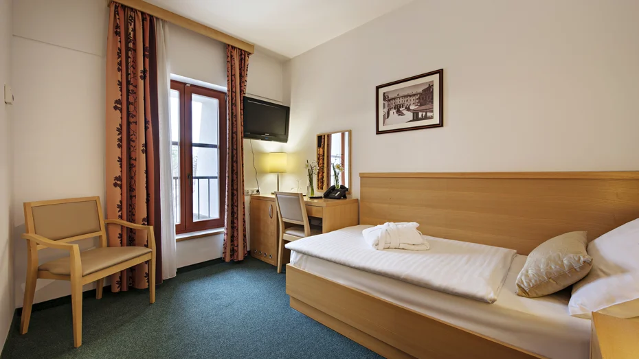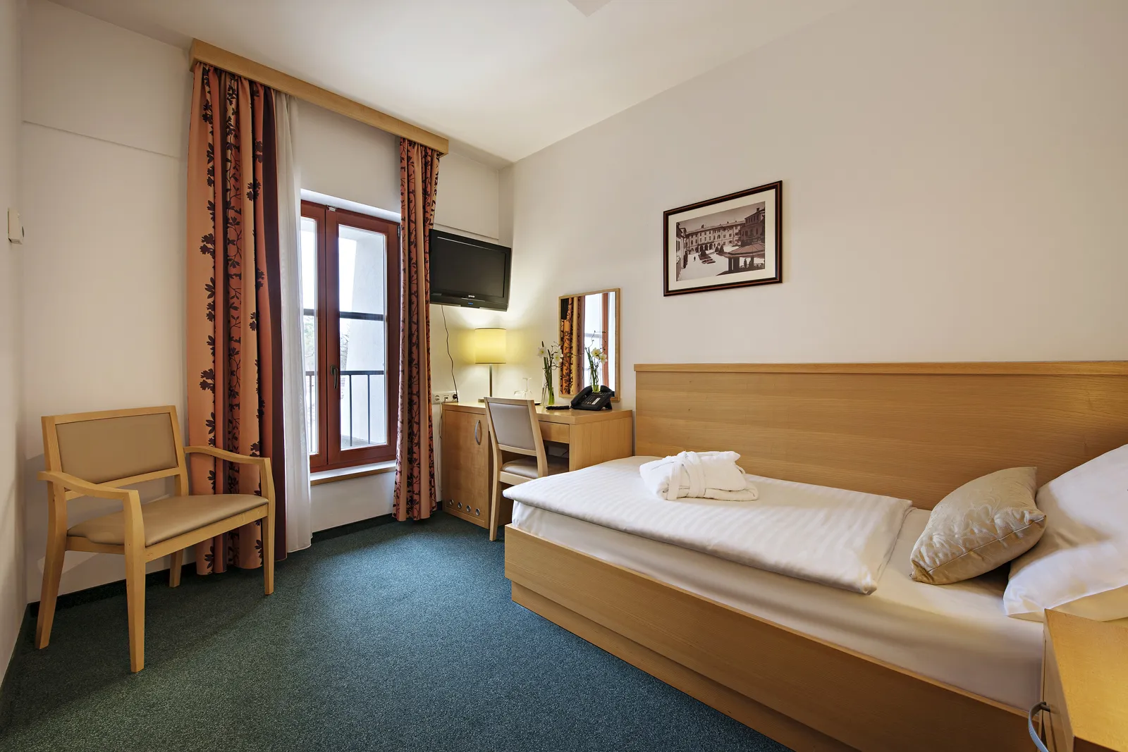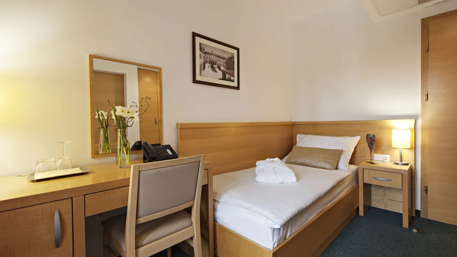 Confortevole camera singola con letto singolo (90x190 cm) e vista sul parco. La camera di 12,9 m2 dispone di bagno con doccia e toilette, scrivania.