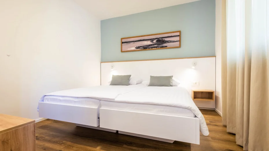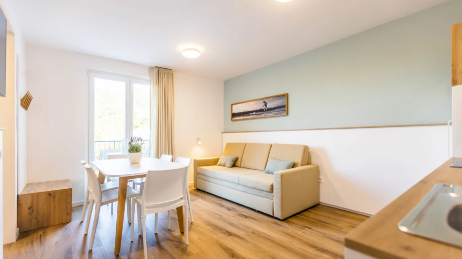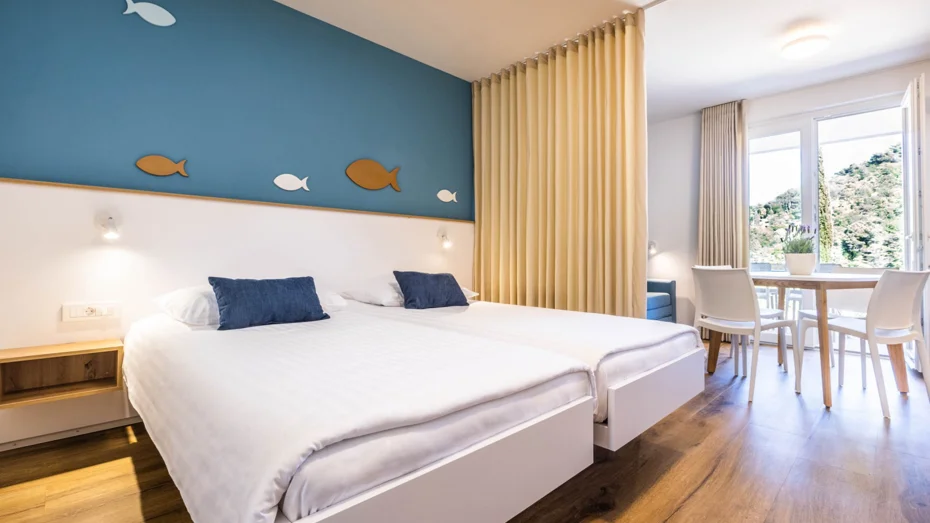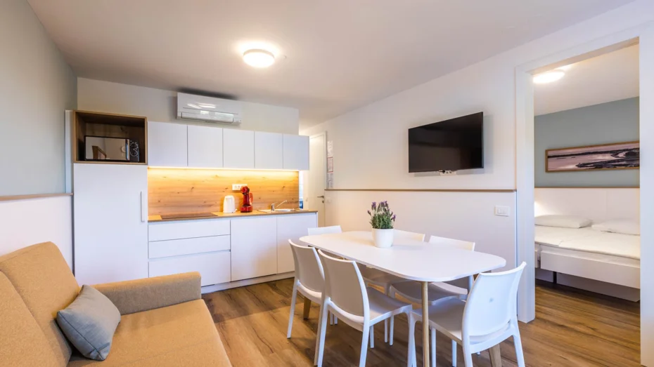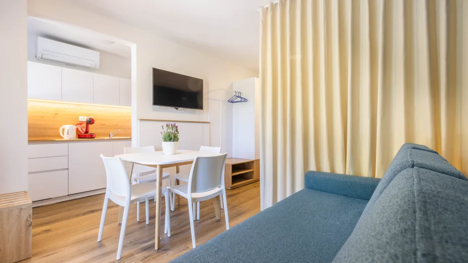 Apartma je opremljen z: indukcijskim kuhališčem, mikrovalovno pečico, hladilnikom z zamrzovalnim delom, pomivalnim strojem, posodo, pripomočki, priborom in krožniki za 4 osebe, aparatom za kavo Dolcegusto, grelnikom za vodo, klima napravo za vse prostore, električnim radiatorjem v kopalnici, LED TV, sušilcem za lase, posteljnino in brisačami. Studio apartmaji so sestavljeni iz: dnevnega prostora, kuhinjske niše, kopalnice s tušem, terase ali balkona. Velikost apartmaja: 28m Velikost postelje: 1 x zakonsko ležišče 160 x 200 + raztegljiv kavč za 2 osebi