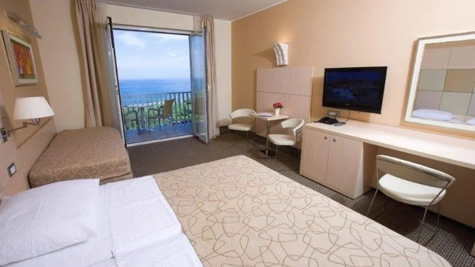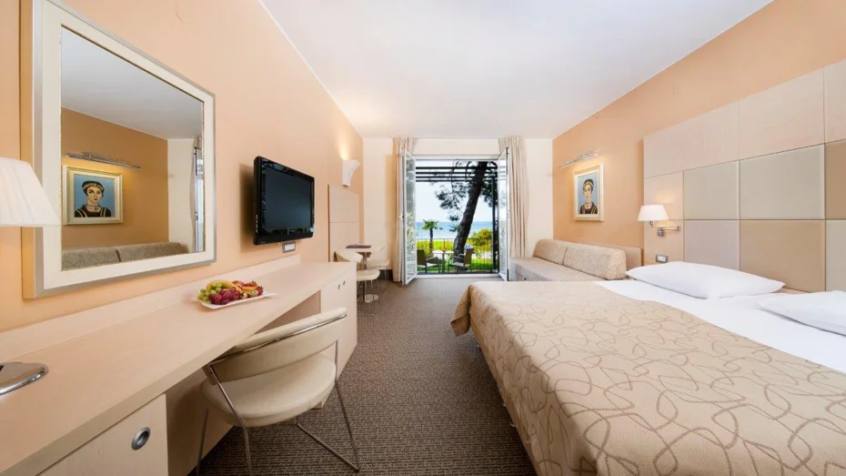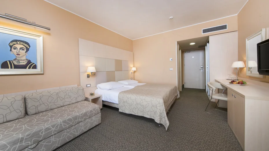 Ponudba v sobi: balkon, telefon, SAT-TV, kopalnica s tuš kabino, fen, klima, minibar, sef. Velikost sobe: 31 m2 Velikost postelje: 1 zakonska postelja + raztegljiv kavč Soba lahko sprejme enega otroka na dodatnem ležišču do 15. leta starosti brezplačno.