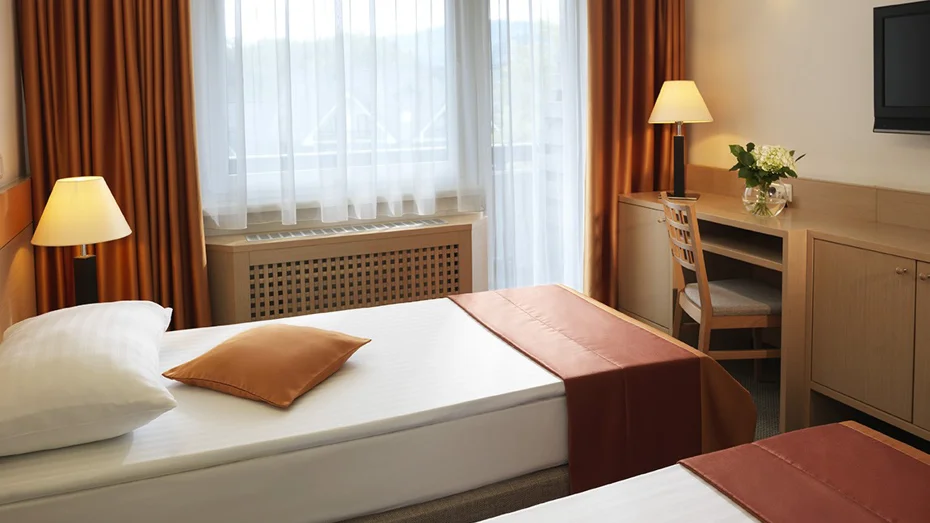 Udobna dvoposteljna soba z balkonom s pogledom na park. V sobi (18 - 20 m2) z dvema ležiščema širine 90 cm ali enim ležiščem širine 180 cm je pisalna miza, televizija, brezplačni WIFI dostop ter kopalnica s tušem in WC.