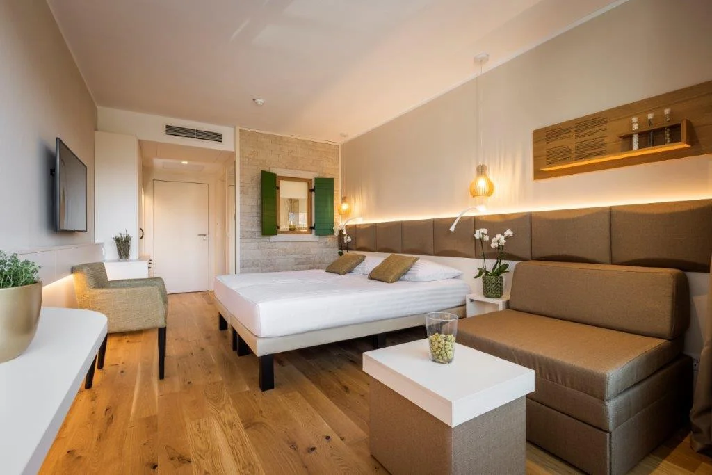Ponudba v sobi: balkon, SAT TV, telefon, radio, mini bar, klimatska naprava, pisalna miza, kopalnica – tuš, sušilec za lase, paket za osebno higieno, sef, mini bar, storitev bujenja/budilka. Velikost sobe: 50 m2 Velikost postelje: 2 x zakonska postelja 160 x 200 cm ali z ločenimi ležišči 90 x 200 cm Soba lahko sprejme dva otroka na dodatnih ležiščih do 14,99 leta starosti brezplačno.