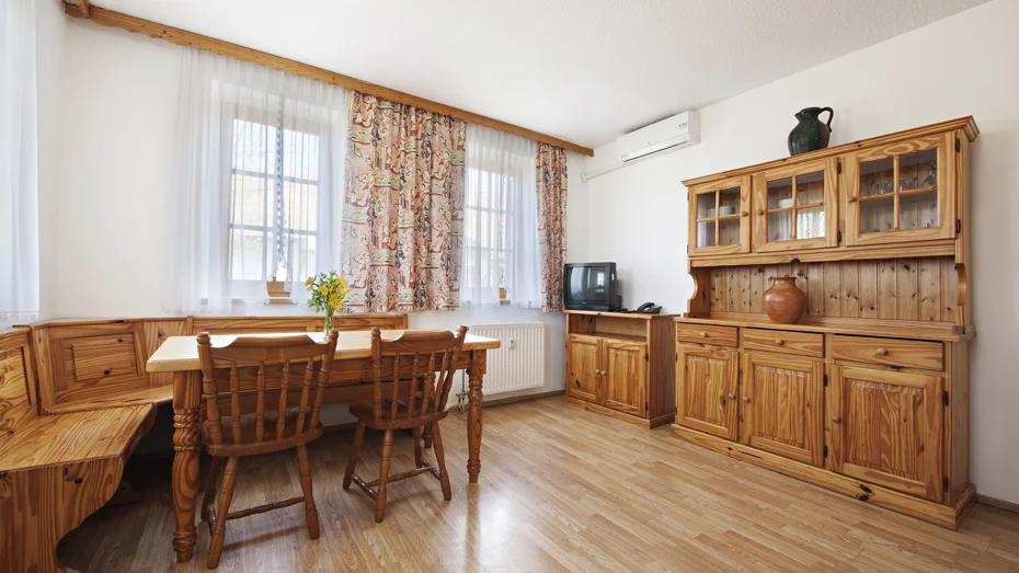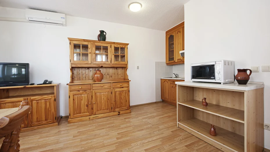 Prostoren in udoben apartma za štiri osebe z zakonsko posteljo 200 x 160 v zgornjem nadstropju in dodatnim ležiščem v prostoru, ki se nahaja v zgornjem delu apartmaja. V apartmaju (70,00m2) je kopalnica s tušem in WC-jem, kuhinjska niša in jedilna miza v spodnjem delu apartmaja ter zunanja terasa.