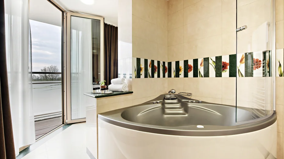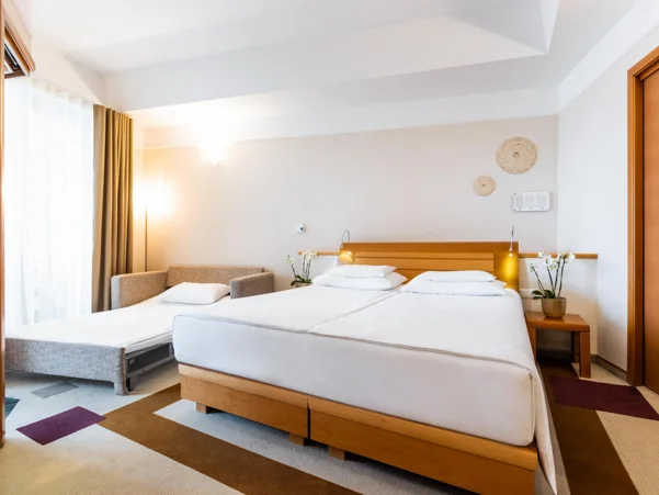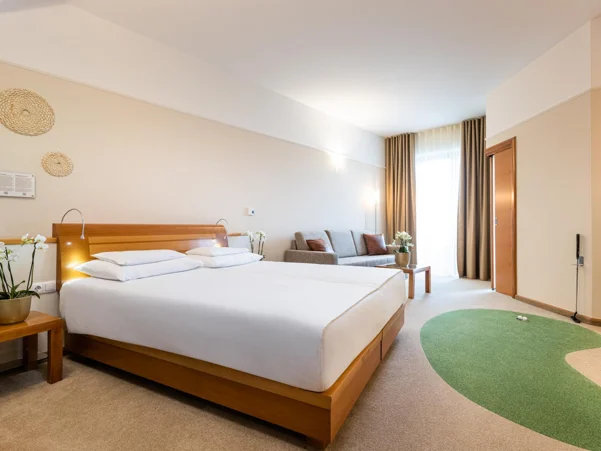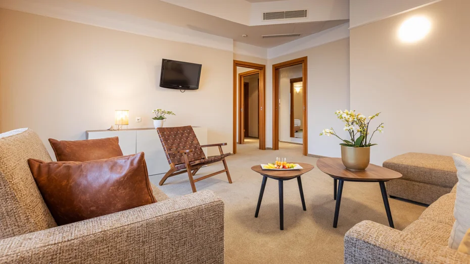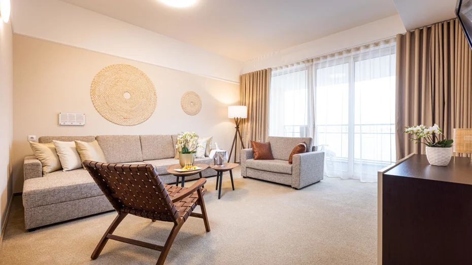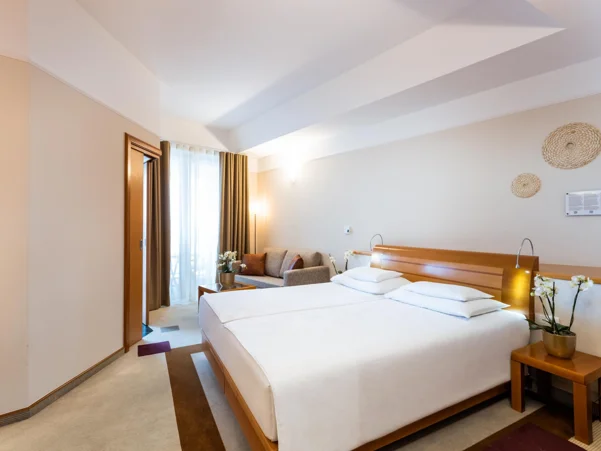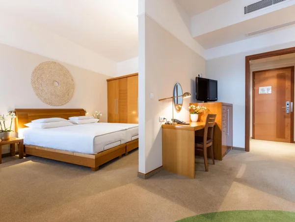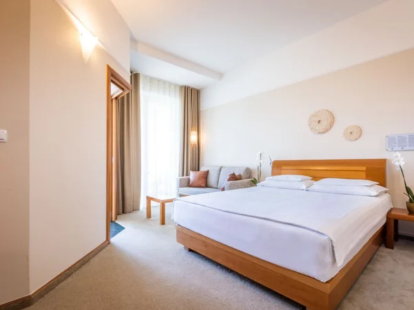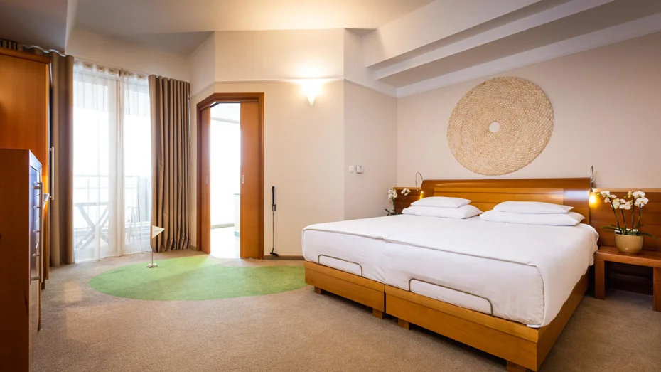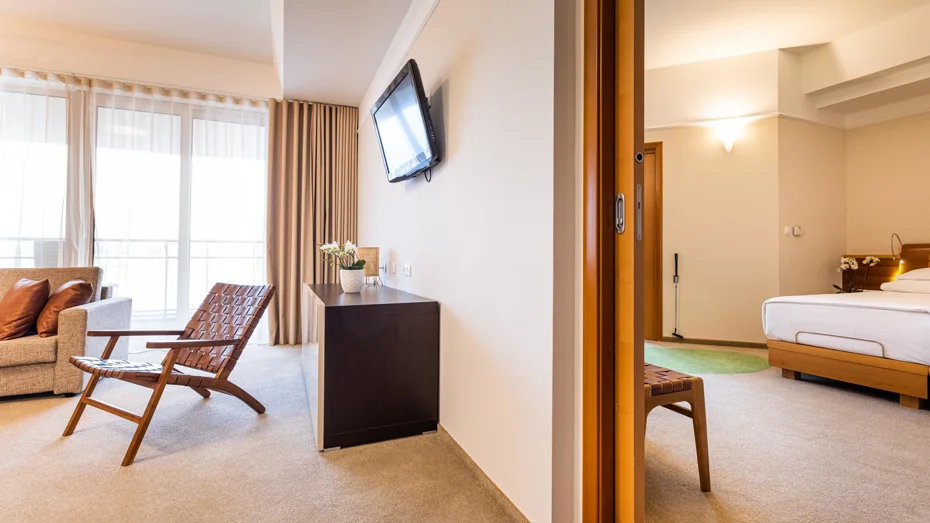 Elegantna in udobna suita z dvema ločenima prostoroma, zakonskim ležiščem širine 180 cm in balkonom z odličnim razgledom. V sobi (57 - 65 m2) je kopalnica s kadjo s termalno in običajno vodo, ločen tuš in WC, pisalna miza ter sofa.